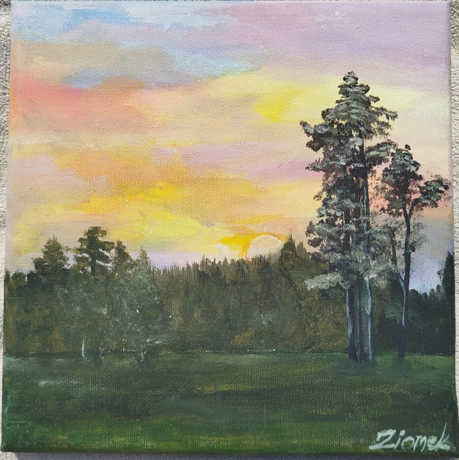Obraz wykonany został farbami akrylowymi na płótnie. Do zabezpieczenia wykorzystano werniks wysokiej jakości. Dzieło przedstawia ostatnie chwile przed zachodem słońca na śródleśnej polanie. Obraz namalowany został w duchu impresjonizmu, w ciepłych barwach, które wprowadzają spokój i harmonię. "Na polanie" świetnie prezentuje się w otoczeniu pastelowych beżów i innych jasnych kolorów.