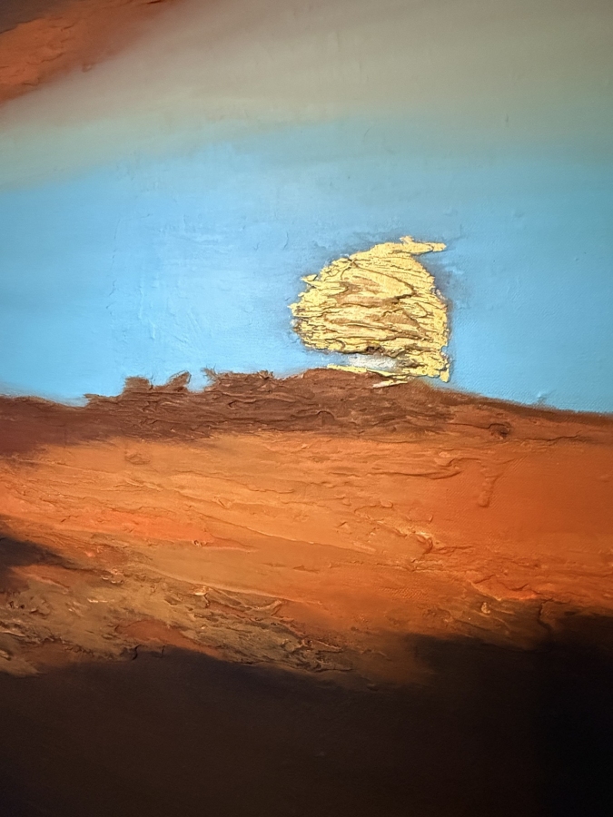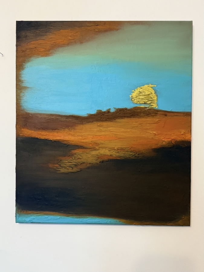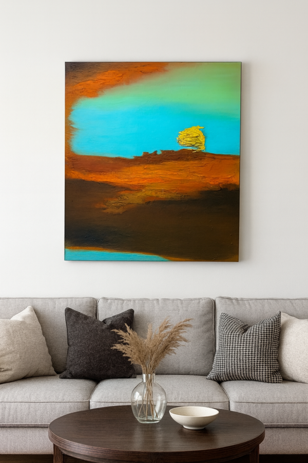 Abstrakcyjny pejzaż pełen ciepła i energii. Intensywny turkus nieba przenika się z głębokimi, ziemistymi odcieniami brązu i pomarańczu, tworząc atmosferę zachodzącego słońca. Mocna faktura farby daje obrazowi dynamiki i sprawia, że wygląda jak żywy. Idealny do nowoczesnych wnętrz, które mają emanować spokojem, harmonią i naturalnym ciepłem.