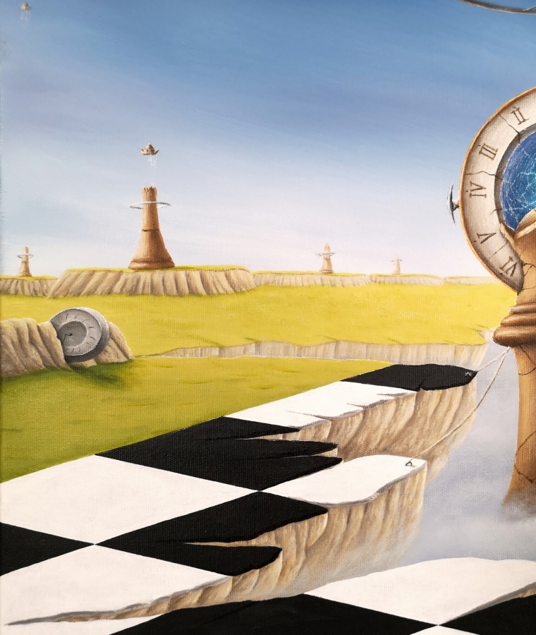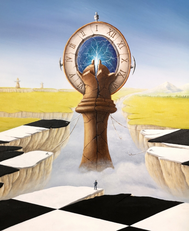 surrealizmfantastykarealizm magicznynadrealizmpejzażPejzaż fantastycznyKrajobrazszachyszachownicapionekwieżamotyw szachówczasmotyw czasuZegarportalportal czasuMalarstwoobrazSztuka Współczesnaakryl