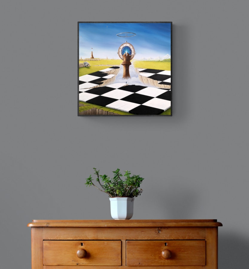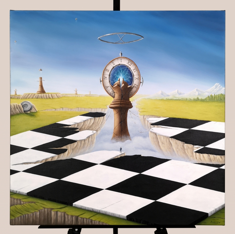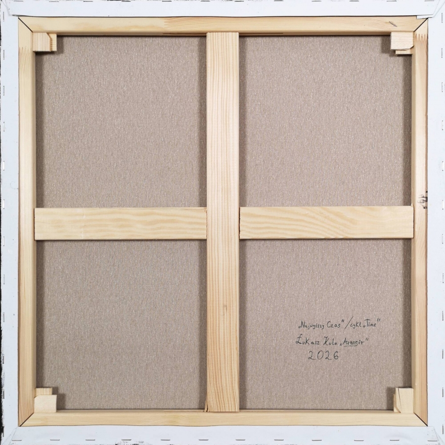 Obraz akrylowy na płótnie bawełnianym, malarstwo surrealistyczne. Praca sygnowana: z przodu - podpis artysty „Asensir”, z tyłu – tytuł / podpis, imię i nazwisko artysty / rok powstania. Praca nie zawiera ramy, boczne krawędzie płótna zamalowane estetycznie na czarno - obraz gotowy do powieszenia. Wymiary: 60x60x2cm. Obrazy artysty są spojrzeniem w świat snów. W pracach z cyklu „Time” zgłębia on naturę czasu - jego złożoność, iluzoryczność i wpływ na nasze decyzje oraz sposób postrzegania rzeczywistości. Kompozycje, portale i motyw szachów tworzą spójny system symboli - metaforę wyborów, przemijania i nieustannej gry między tym, co kontrolowane, a tym, co wymyka się przewidywaniom. „Time” to opowieść o naszych ruchach w ponadczasowej rozgrywce - próba uchwycenia jednocześnie ulotności i trwałości doświadczeń. To świat, w którym czas przestaje być prostą linią i zamienia się w labirynt - przestrzeń poszukiwania własnej drogi, szans i utraconych momentów. Prace artysty znajdują się w prywatnych kolekcjach w Polsce oraz m.in. w USA, Japonii, RPA, Niemczech, Hiszpanii, Francji, Izraelu.