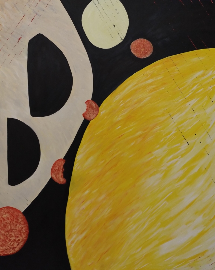 Płótno bawełniane, ramka 2 cm. Farba olejna, techniki łączone, wykonanie pędzel + sznurek. Obraz odnajdzie się w najlepiej w monochromatycznym wnętrzu, któremu doda niebanalnej energii.