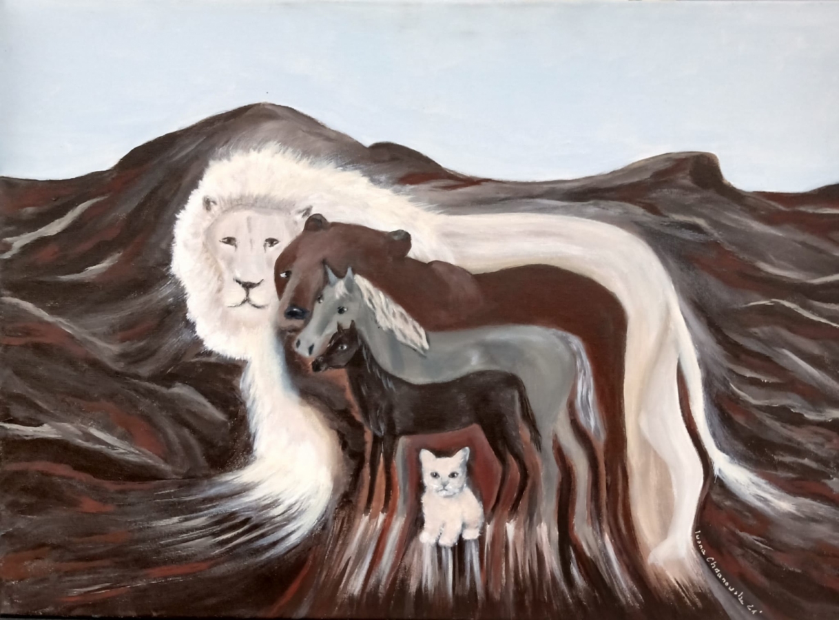 Obraz namalowany farbami akrylowymi marki Renesans i Amsterdam na płótnie w poziomie. Koncepcja połączenia spokojnych zwierząt z drapieżnikiem, odwraca postrzeganie świata, w którym dominuje łańcuch pokarmowy. Obraz pięknie prezentuje się na jasnej ścianie.