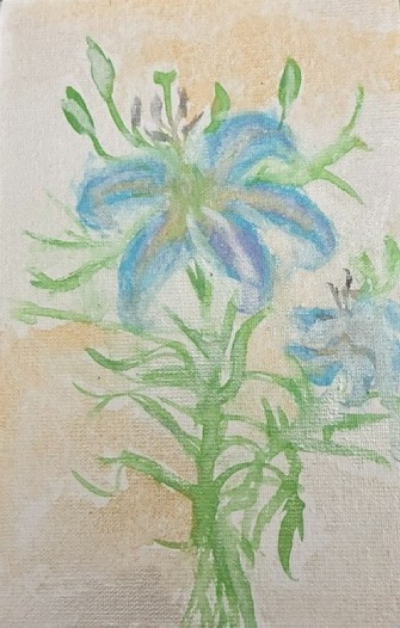 Obraz zatytułowany " Niebieski kwiat" przedstawia delikatny kwiat o szerokich, rozłożystych płatkach, przypominający nieco lilię lub egzotyczną roślinę. Dominują tu kolory niebieski i zielony, które płynnie się ze sobą łączą, tworząc lekką kompozycję akwarelą. Tło ma ciepły, beżowy, piaskowy odcień, nadający całości wygląd lekko postarzanego papieru. Pociągnięcia pędzla są miękkie i rozmyte, co sprawia, że cały obraz wydaje się eteryczny i spokojny. Zieleń łodygi i liści jest świeża, ale nie intensywna, co podkreśla naturalny charakter motywu. Dzieło wywołuje poczucie spokoju i delikatności, jakby uchwyciło chwilę zatrzymaną w czasie. Generalnie może ono przywodzić na myśl delikatność natury i spokój letniego poranka.