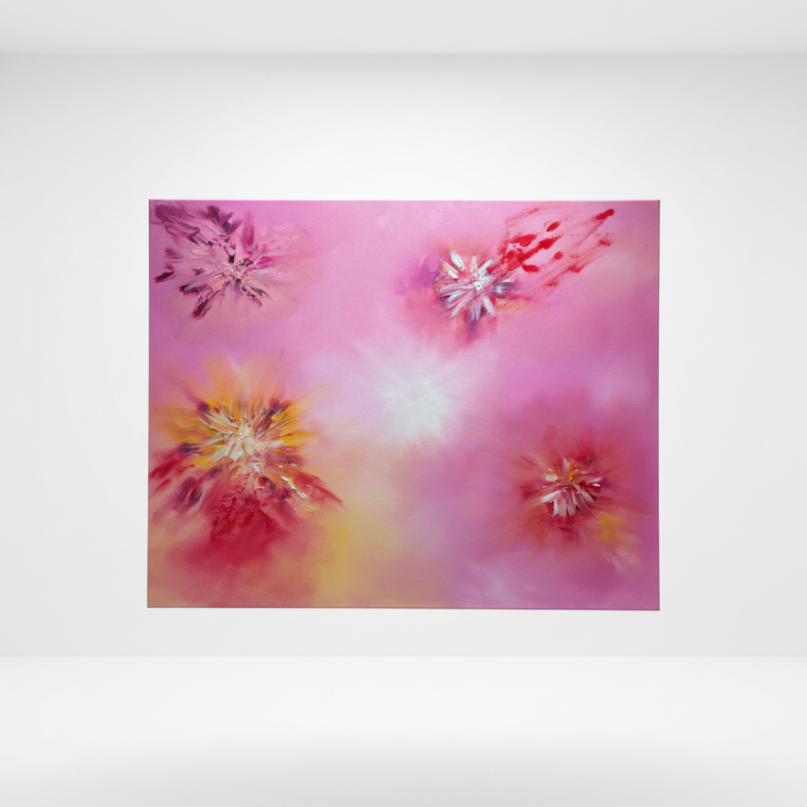 „Orgazmy” (olej na płótnie, 100 × 80 cm) Praca wykonana techniką olejną na płótnie bawełnianym o wymiarach 100 × 80 cm. Wykorzystane zostały wysokiej jakości farby olejne o intensywnej pigmentacji, nakładane warstwowo i z wyczuwalną fakturą impastu, która nadaje obrazowi głębię i ekspresję. „Orgazmy” to eksplozja życia – pulsująca, zmysłowa i bezwstydnie szczera. Obraz staje się metaforą kulminacji emocji i spotkania energii, które przekraczają granice ciała. Róż, fuksja i purpura nie są tu dekoracją, lecz językiem intensywności – kolorem tętna, rozżarzenia i momentu, w którym myśl ustępuje czystemu odczuwaniu. To nie erotyka w dosłownym sensie, lecz afirmacja życia – jego drżenia, przepływu i ekstazy. Każdy impast, każdy rozbłysk barwy jest gestem wyzwolenia. Na płótnie nie ma postaci, a mimo to wibruje cielesność. Nie ma pejzażu, a jednak obecna jest natura człowieka. Praca stanowi zapis energii w stanie pierwotnym – jak moment narodzin gwiazdy zamknięty w ciele. „Orgazmy” są hymnem na cześć życia, kobiecości i siły, której nie da się zatrzymać. Obraz idealnie zaprezentuje się w przestrzeniach nowoczesnych i minimalistycznych – w salonie, gabinecie, hotelowym lobby lub prywatnej kolekcji sztuki współczesnej. Słowa kluczowe: obraz olejny, sztuka współczesna, obraz abstrakcyjny, kobieca energia, ekspresyjna sztuka, impast, rękodzieło artystyczne, obraz do salonu, obraz na prezent.