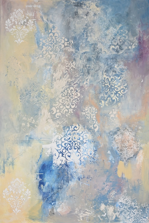 Obraz utrzymany w jasnej, pastelowej palecie łączy subtelną abstrakcję z dekoracyjnymi motywami ornamentów. Na powierzchni płótna przenikają się chłodne błękity, pudrowe róże, delikatne żółcie i akcenty bieli, tworząc lekką, świetlistą kompozycję. Wyraźne, koronkowe wzory pojawiają się niczym odbicia dawnych tapiserii – jak wspomnienia zapisane w warstwach farby. Faktury nadają pracy głębię, a transparentne przejścia kolorów budują atmosferę spokoju i lekkości. Dzieło ma charakter efemeryczny i elegancki, jakby unosiło się między światem materialnym a ulotnością dekoracyjnych motywów. To obraz, który przynosi do wnętrza harmonię, światło oraz subtelne poczucie nostalgii.