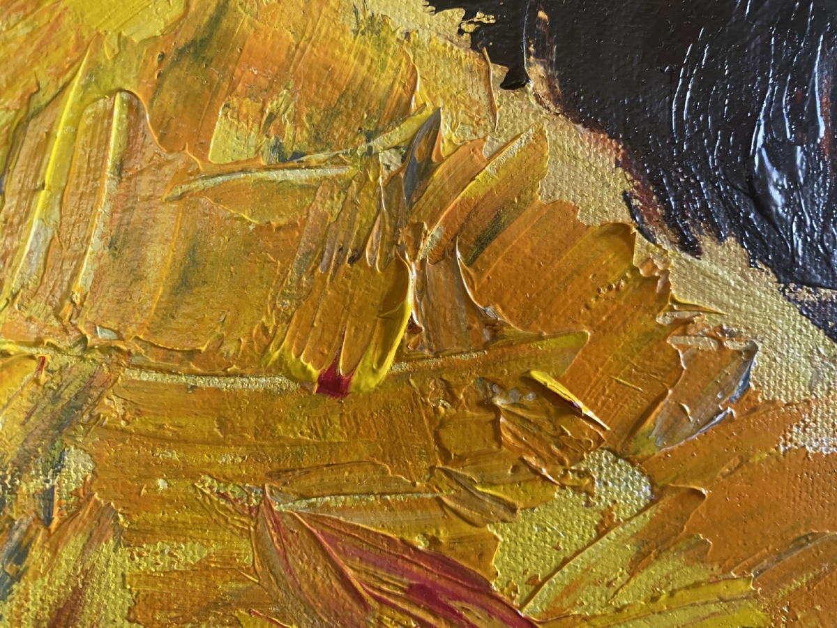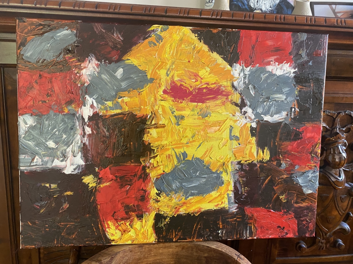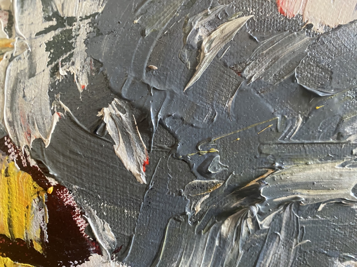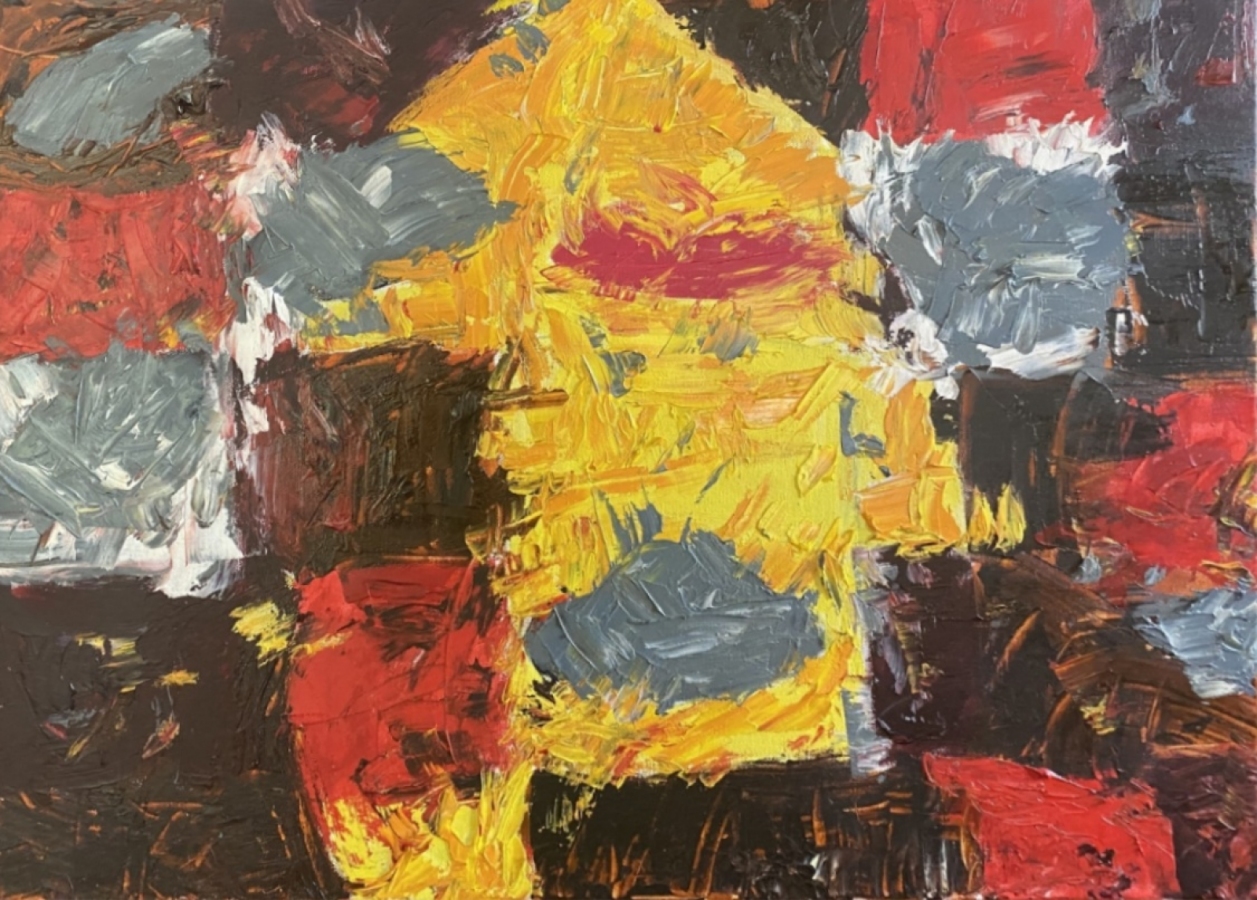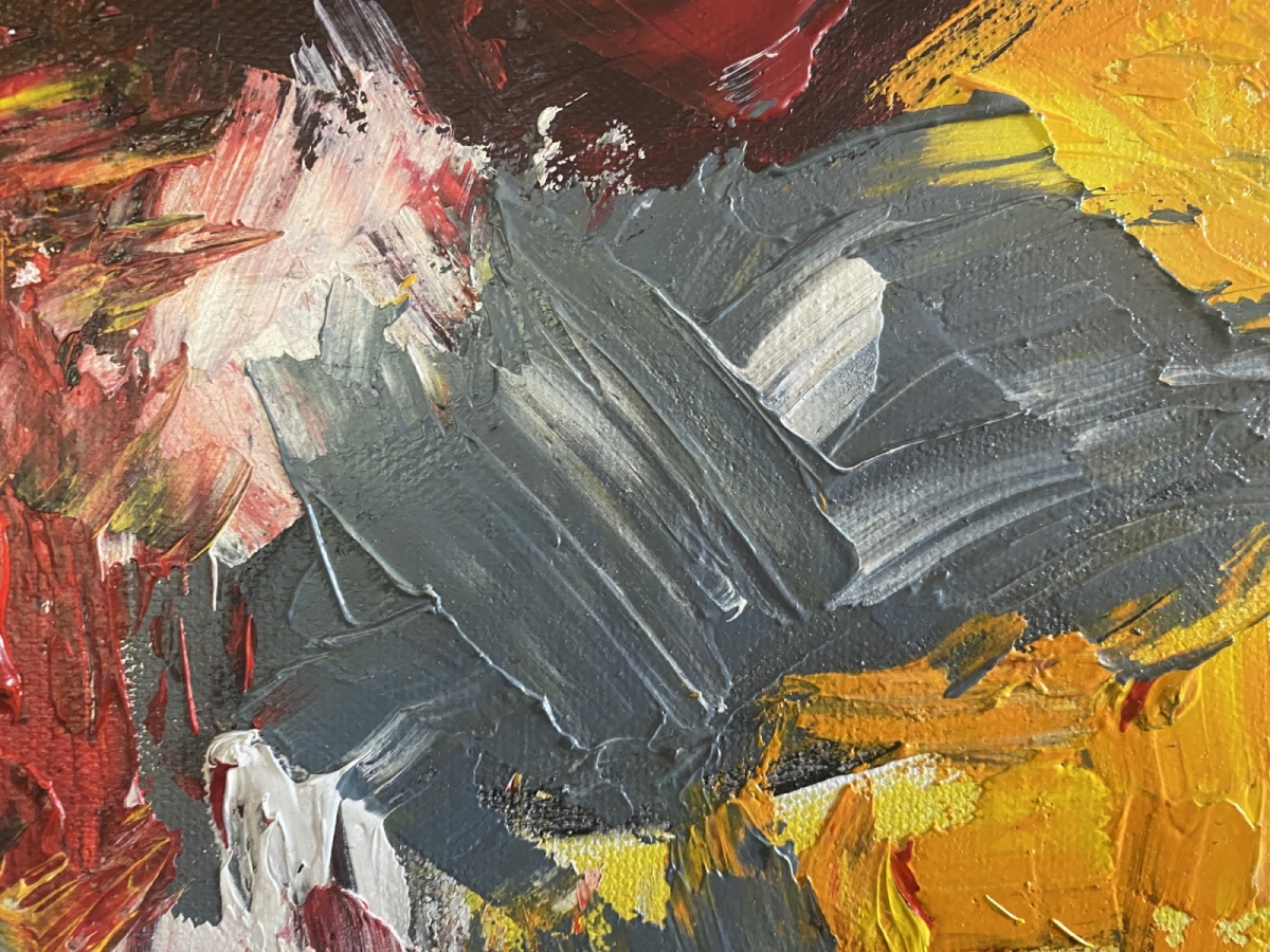 Rytm kładzie się plamami: żółcie, szarości i czerwień zderzają się jak wspomnienia, które nie chcą się ułożyć. Faktura jest szczera, ekspresyjna, bez filtra. Ta praca ożywia przestrzeń i dodaje jej charakteru – idealna, gdy szukasz obrazu, który „pracuje” z każdym światłem dnia.
