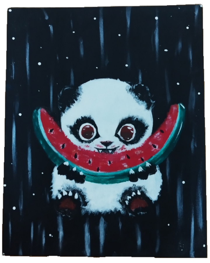 Praca przedstawia pandę trzymającą arbuza, wygląda niewinne lecz ukazane pazury ujawniają siłę jaką w sobie trzyma. Obraz namalowany akrylami, które było nakładane pędzlami. Praca jest umieszczona na płaskim płótnie, której grubość wynosi 3 mm. Waga tego dokładna wynosi 180 gram.