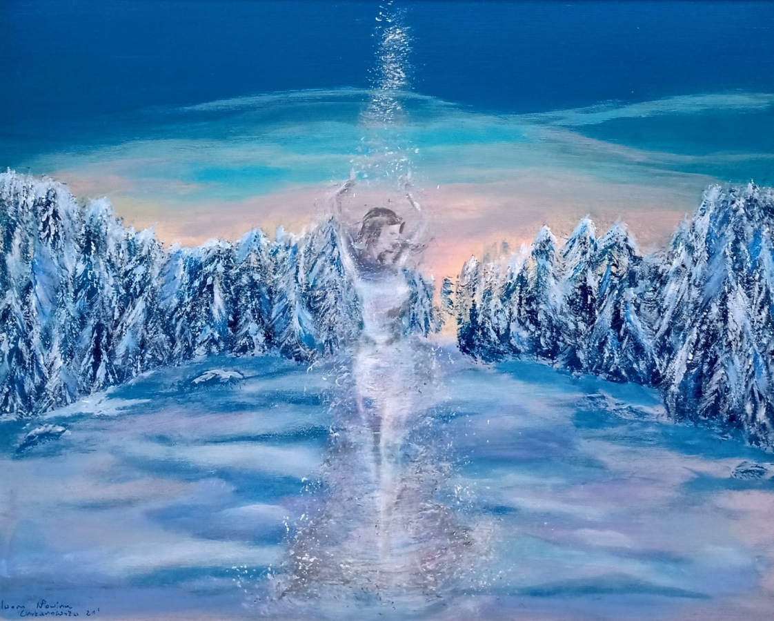 Obraz namalowany farbami akrylowymi Renesans i Amsterdam na płótnie w pionie. Abstrakcyjna postać kobiety uformowana ze śniegu i wiatru. Wizualizacja zimy. Boki są zamalowane, zamontowana zawieszka.