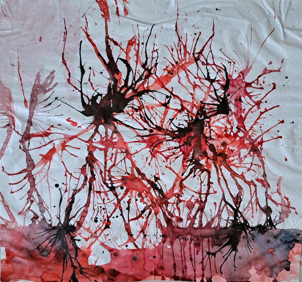 Praca "Parasite" powstała w końcu 2020 roku jako reakcja na podzieje podczas protestów na Białorusi. Chaotyczne działanie ostrych czarnych i czerwonych linii na białym tle symbolizuje walkę o przestrzeń i prawo na głos w miejscu, gdzie już ponad trzydzieści lat panuje przemoc.
