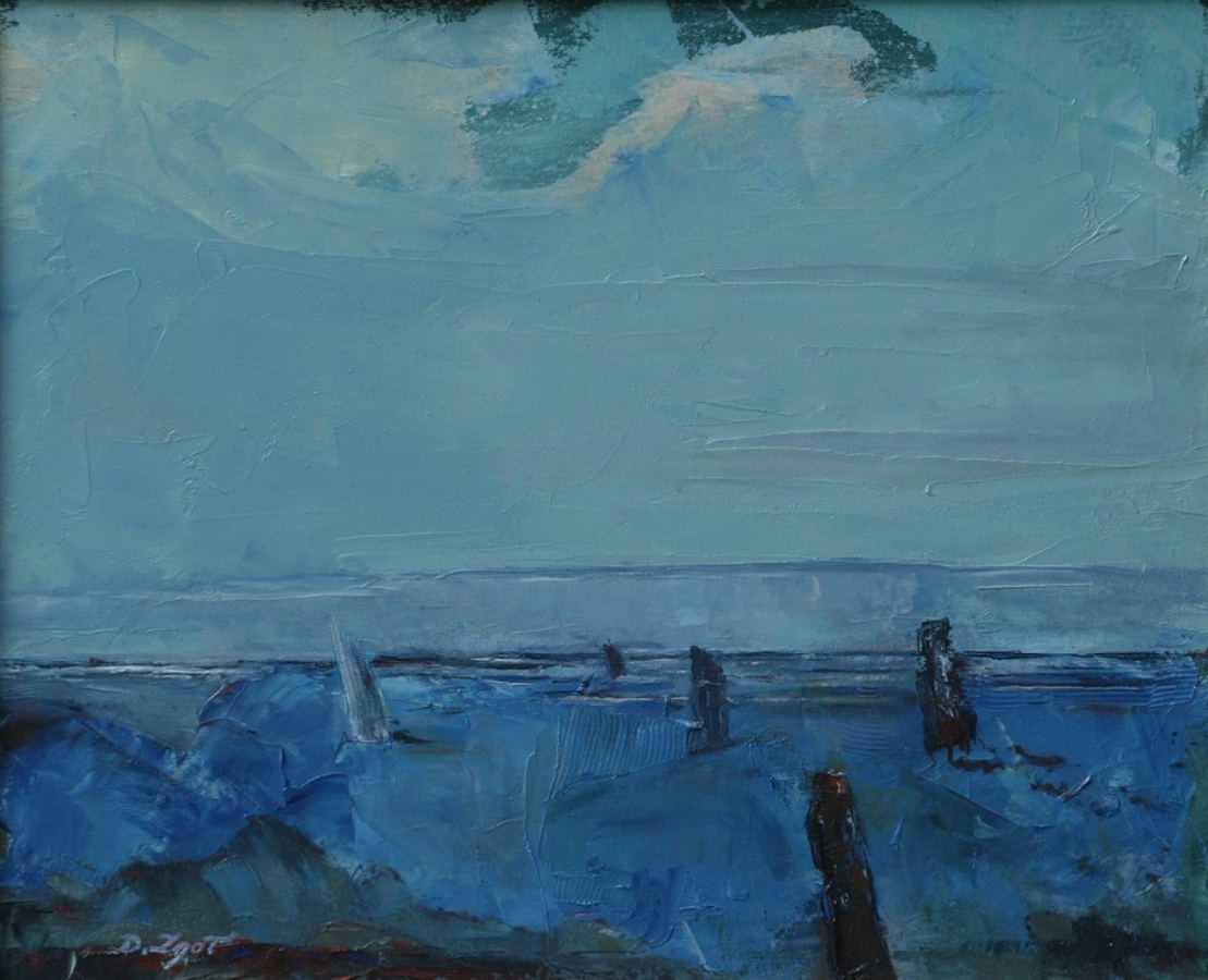 "Pejzaż surrealistyczny z czterema kamiennymi obeliskami i samotnym białym żaglem" - autorski obraz olejny. Wymiary: 38 cm x 46 cm. Sygnowany. Płótno na sosnowym blejtramie. Na życzenie do obrazu dołączony Certyfikat autentyczności.