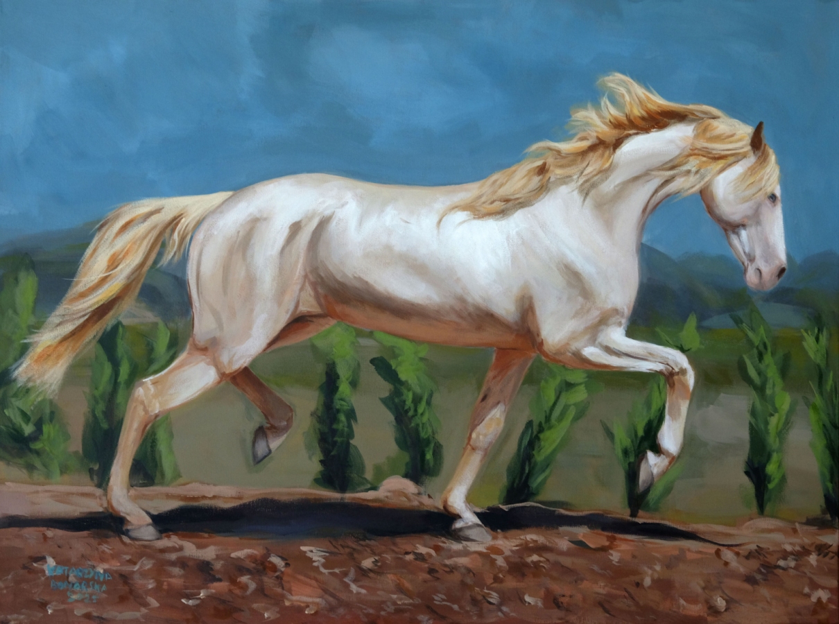 Obraz został namalowny farbą akrylową na płónie. Przedstawia konia rasy andaluzyjskiej. Praca również dostępna jako print o rozmiarach 40x50cm. Dzieło najlepiej sprawi się jako prezent lub jako urozmaicenie salonu.