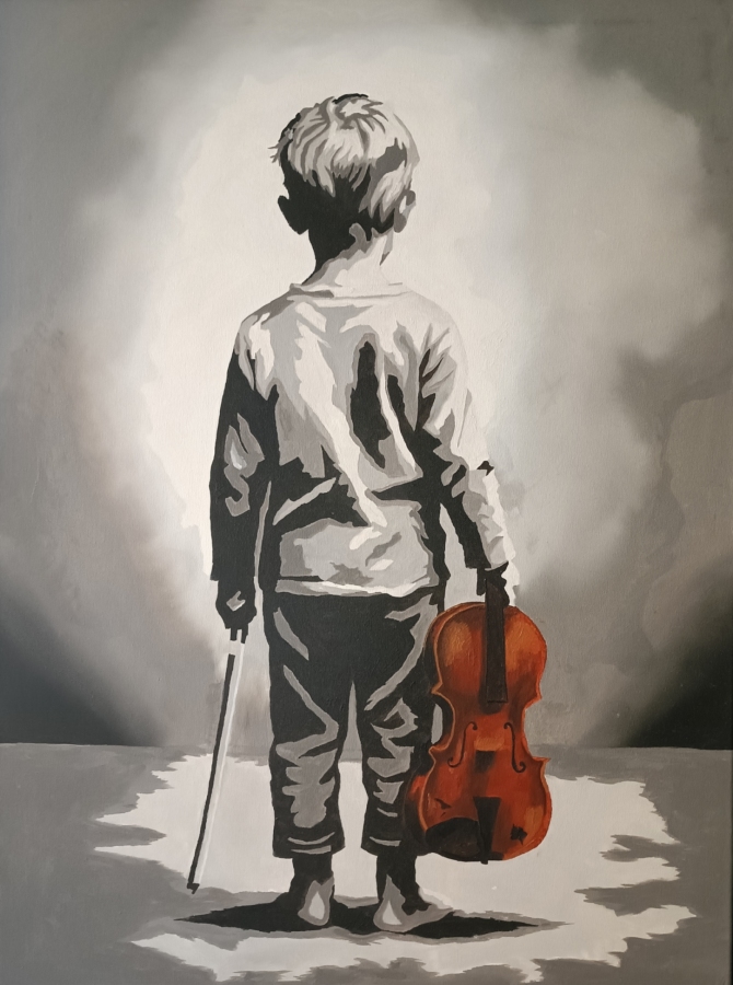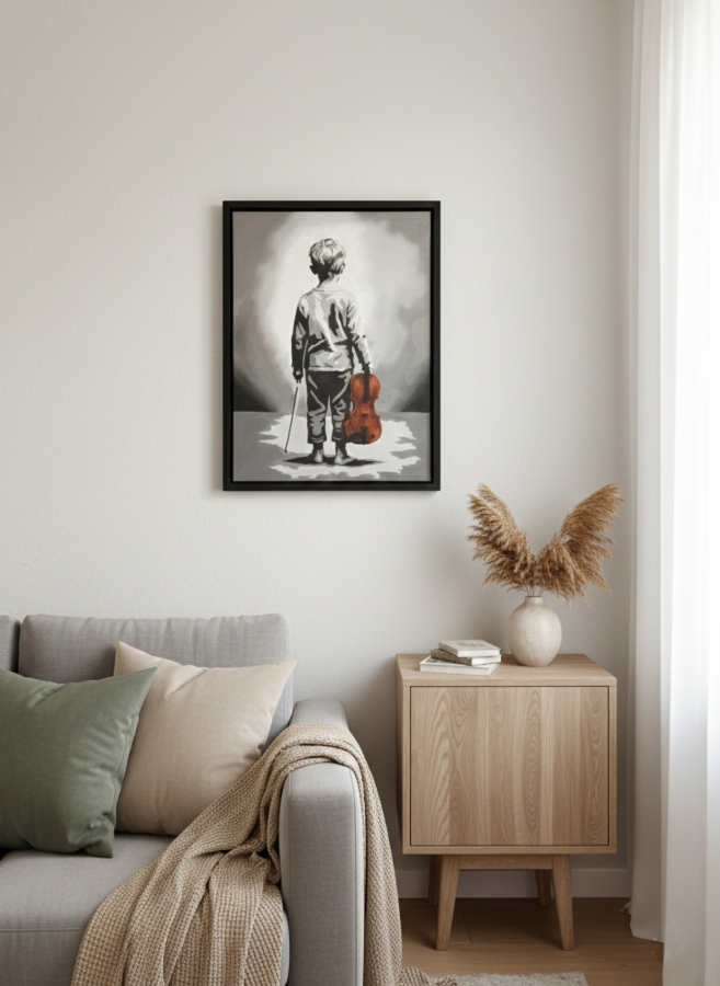 Obraz jest częścią cyklu malarskiego poświęconego odkrywaniu talentów i predyspozycji, które rodzą się w nas bardzo wcześnie często jeszcze zanim potrafimy je nazwać. Cykl prowadzi widza od dzieciństwa, przez pierwsze wybory i próby, aż po dorosłość. Przedstawiona postać dziecka stojącego tyłem symbolizuje moment skupienia i ciszy przed początkiem drogi. Skrzypce trzymane w dłoni są znakiem potencjału, który dopiero czeka na rozwinięcie. To obraz o pierwszym impulsie, o wewnętrznym przeczuciu, że coś jest „nasze”, nawet jeśli jeszcze nie wiemy dokąd nas zaprowadzi. Stonowana, ograniczona paleta barw buduje spokój i skupienie, a pojedynczy akcent koloru kieruje uwagę na talent jako centralny punkt opowieści. Praca pozostawia przestrzeń na własne interpretacje — każdy może zobaczyć w niej swoją historię lub historię kogoś bliskiego. Obraz wykonany techniką olejną na płótnie, oprawiony w czarną, dębową ramę typu american box. Gotowy do zawieszenia, dobrze odnajdzie się we wnętrzach nowoczesnych, minimalistycznych i domowych, gdzie sztuka ma być obecna na co dzień, a nie tylko „do oglądania”.