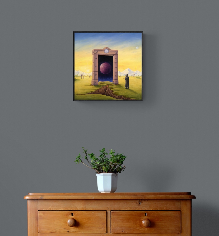 surrealizmfantastykarealizm magicznynadrealizmPejzaż fantastycznypejzażpostać fantastycznapostaćplanetaKosmosportlaportal czasuczasZegarKrajobrazgóryzachód słońcaNieboMalarstwona prezentobrazSztuka Współczesnaakryl