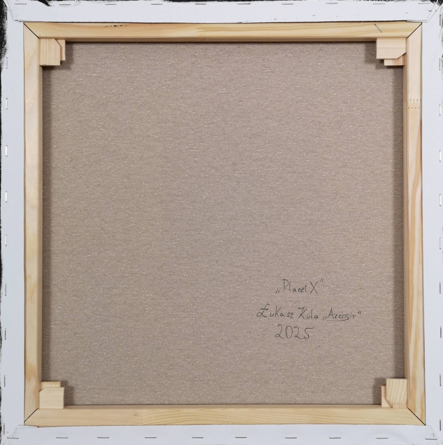 Obraz akrylowy na płótnie bawełnianym, malarstwo surrealistyczne. Praca sygnowana: z przodu - podpis artysty „Asensir”, z tyłu – tytuł / podpis, imię i nazwisko artysty / rok powstania. Praca nie zawiera ramy, boczne krawędzie płótna zamalowane estetycznie na czarno - obraz gotowy do powieszenia. Wymiary: 50x50x2cm. Obrazy artysty są spojrzeniem do świata snów. W pracach z cyklu „Time” artysta zgłębia naturę czasu, szukając sposobu na pokazanie jego złożoności i iluzoryczności. Kompozycje, portale czy szachownice stają się metaforami naszych wyborów, zmian i miejsc, w których przeszłość, teraźniejszość i przyszłość przenikają się w jedno. „Time” to opowieść o naszych ruchach w ponadczasowej rozgrywce, o próbie uchwycenia ulotności, a zarazem trwałości doświadczeń. „Planet X” wpisuje się w ten dialog z czasem i przestrzenią. To podróż poza granice znanego - w miejsce, gdzie nauka styka się z mitem, a przeszłość z przyszłością. Nawiązując do legend o planecie Nibiru, praca staje się metaforą tego, co cyklicznie powraca, choć pozostaje nieuchwytne.