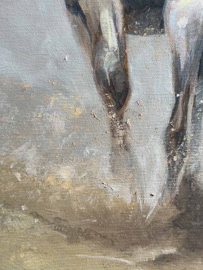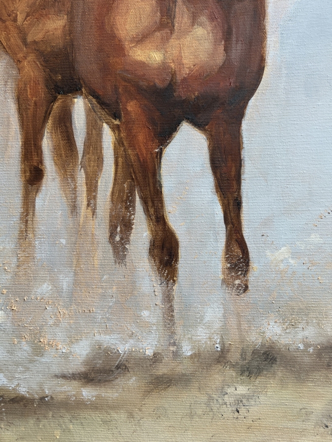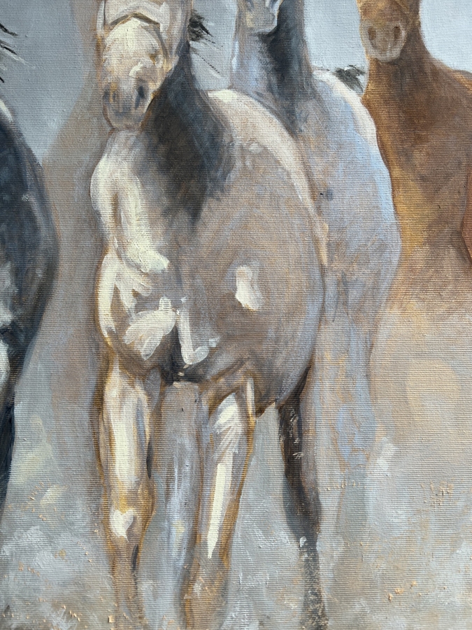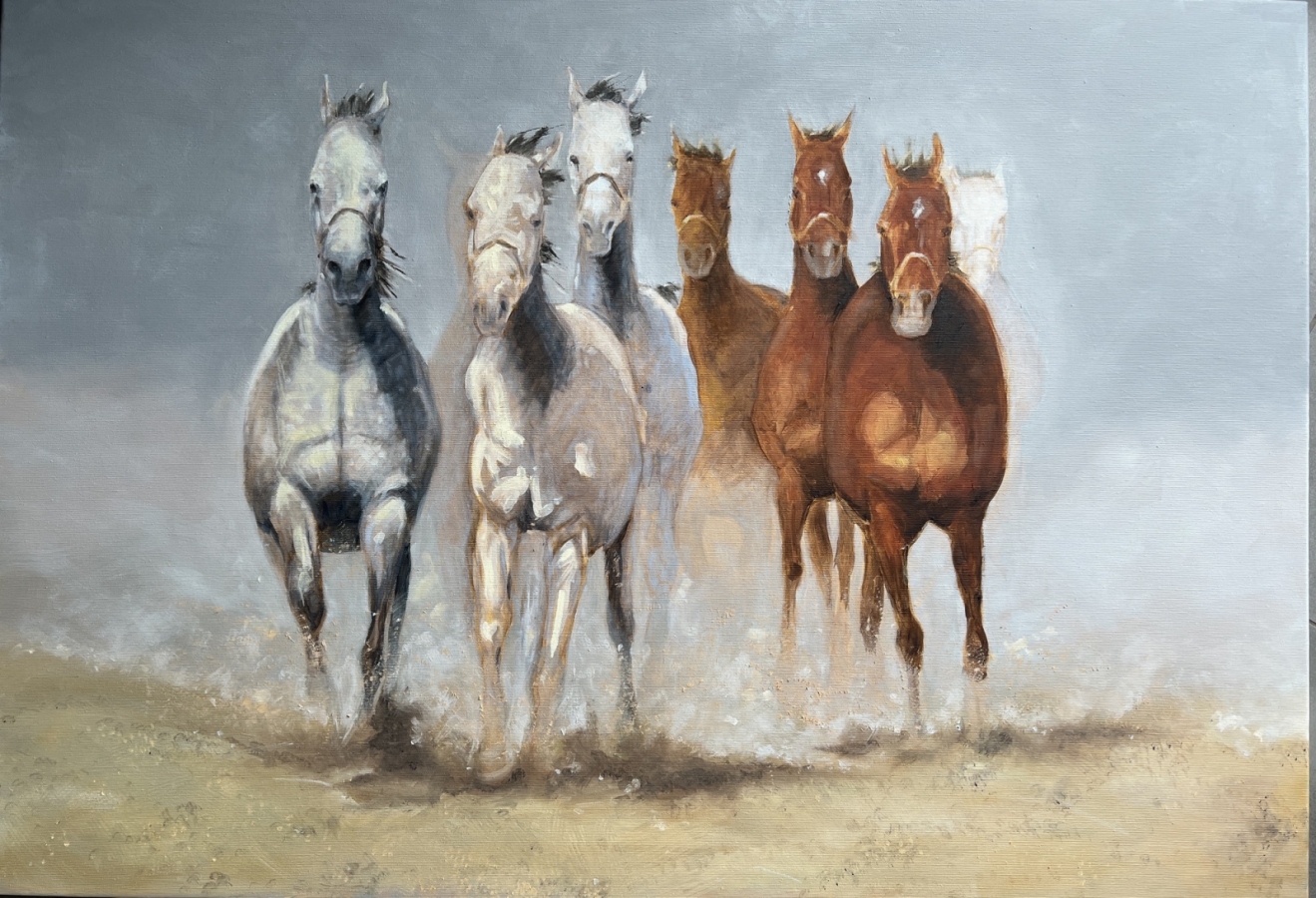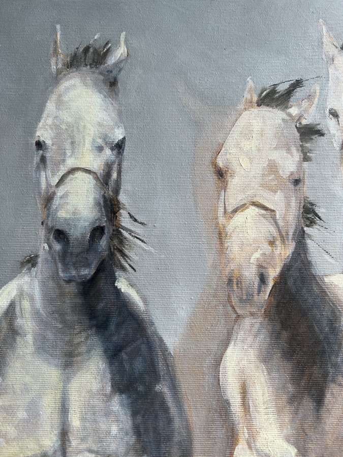 Obraz olejny przedstawiający galopujące konie w ujęciu frontalnym, będący studium ruchu, światła i energii. Kompozycja opiera się na rytmie powtarzających się sylwetek, które stopniowo wyłaniają się z neutralnego, niemal mgielnego tła. Zestawienie chłodnych szarości z ciepłymi brązami buduje napięcie wizualne i prowadzi wzrok widza w głąb obrazu. Artystka świadomie rezygnuje z dosłownego realizmu na rzecz ekspresji i skrótu malarskiego. Widoczna faktura farby, miękkie przejścia tonalne oraz miejscami rozmyte kontury potęgują wrażenie ruchu i ulotności chwili. Obraz nie opowiada konkretnej historii, lecz pozostawia przestrzeń na indywidualną interpretację — staje się zapisem energii, dynamiki i siły natury. Praca została wykonana techniką olejną na płótnie, z użyciem profesjonalnych materiałów malarskich. Jest to dzieło unikatowe, sygnowane przez artystkę na odwrocie, gotowe do ekspozycji w nowoczesnych i klasycznych wnętrzach.