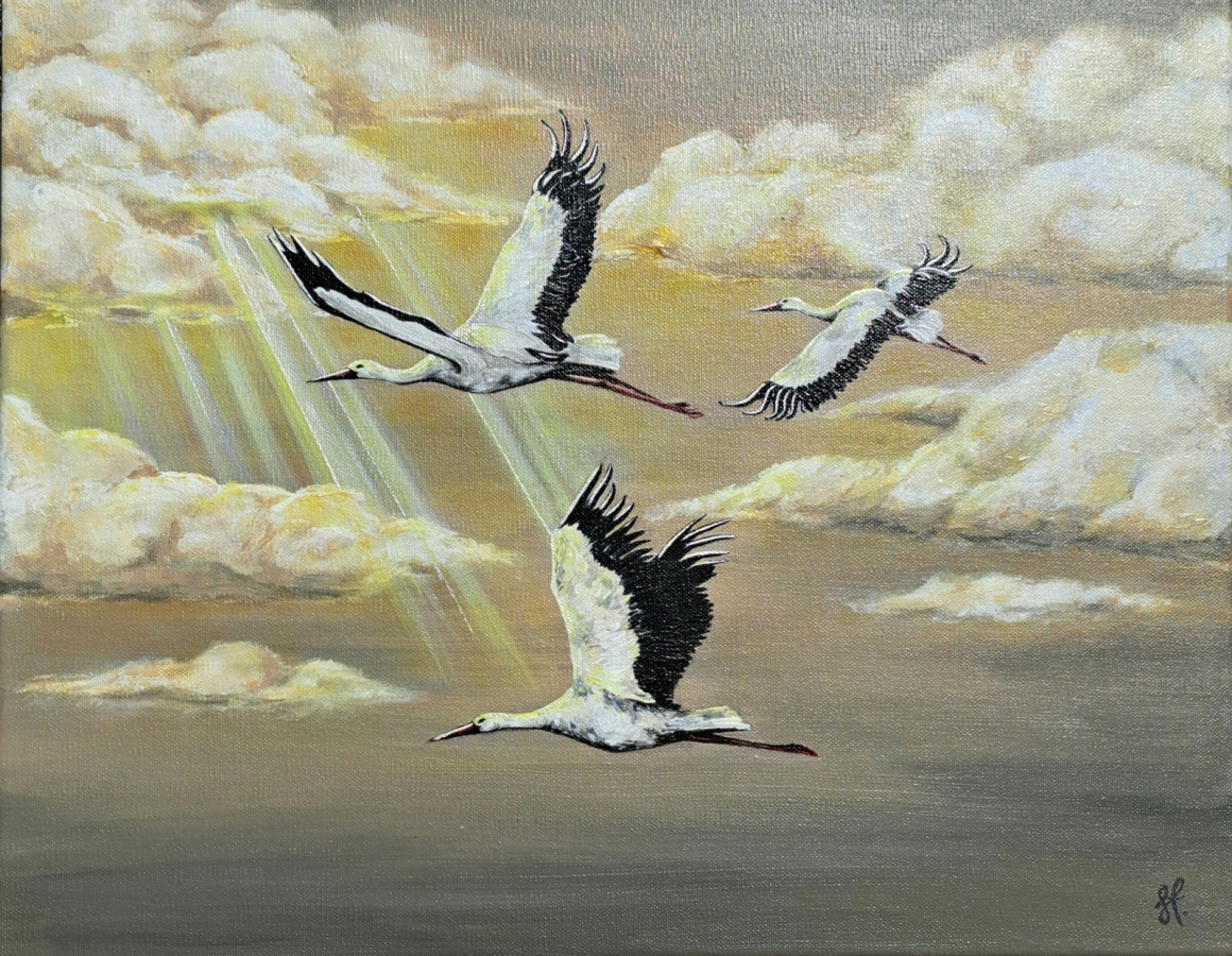 Obraz przedstawiający trzy bociany w locie na tle pochmurnego nieba. Unikatowa, ręcznie wykonana praca, która będzie wspaniałą dekoracją do Twojego domu lub biura. Malowany farbami akrylowymi na płótnie w rozmiarze 40×50.