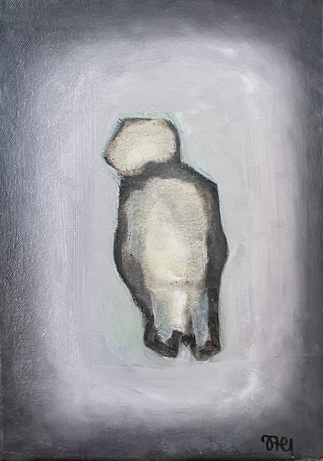 „Prezes przedszkola” to obraz figuratywny o ascetycznej formie, utrzymany w chłodnej, stonowanej gamie szarości i bieli. Centralna postać, pozbawiona wyraźnych rysów, stoi w pustej przestrzeni, jakby zawieszona między światłem a cieniem. Minimalizm kompozycji podkreśla kontrast między tytułem a przedstawieniem — humorystycznym, ale też nieco melancholijnym. W prostocie sylwetki kryje się obserwacja ludzkiej natury: hierarchii, władzy i codziennej absurdalności. Obraz balansuje między żartem a refleksją, zostawiając widzowi miejsce na własne odczytanie.
