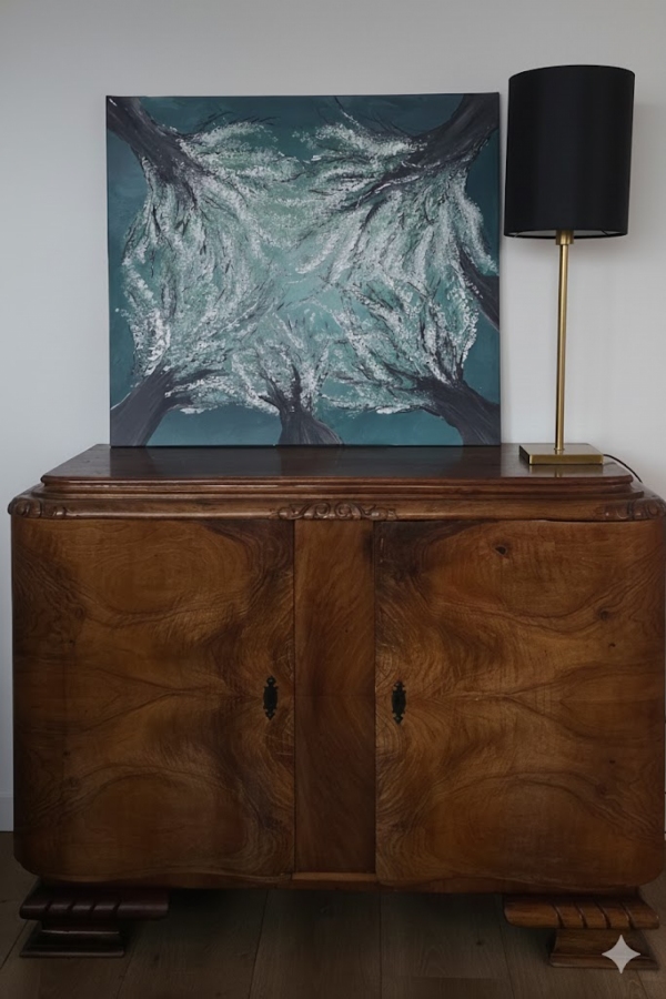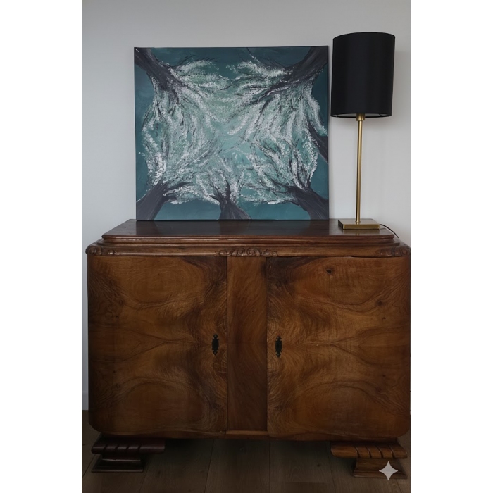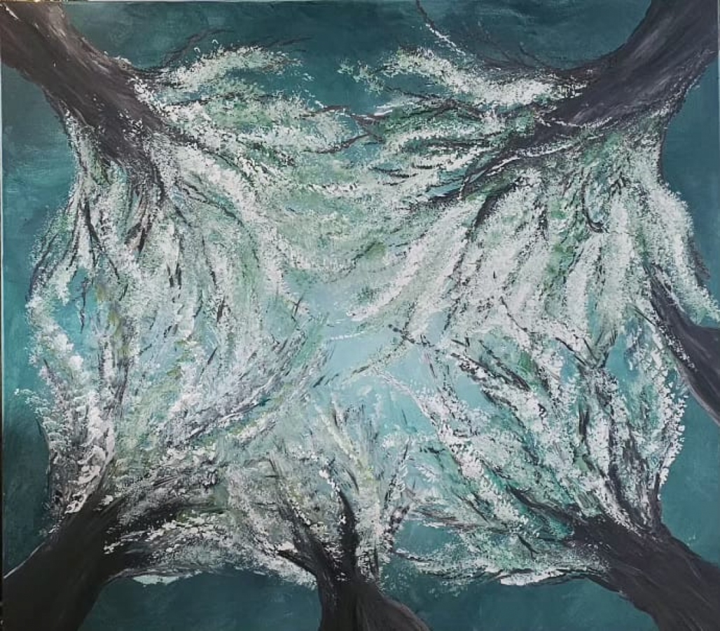 Dynamiczna wizja natury, ujęta z unikalnej perspektywy — prosto spod rozłożystych koron drzew. Intensywny, morski turkus nieba przeplata się z gęstą, niemal architektoniczną strukturą gałęzi, pokrytych puszystym, jasnym listowiem. Obraz został namalowany techniką akrylową na płótnie. Wyrazista faktura farby, szczególnie widoczna w koronach drzew, nadaje pracy dodatkowej głębi i ekspresji. Oddaje uczucie zanurzenia w naturze i podziwu dla majestatu leśnego sklepienia. Idealny dla miłośników nastrojowych, współczesnych pejzaży.