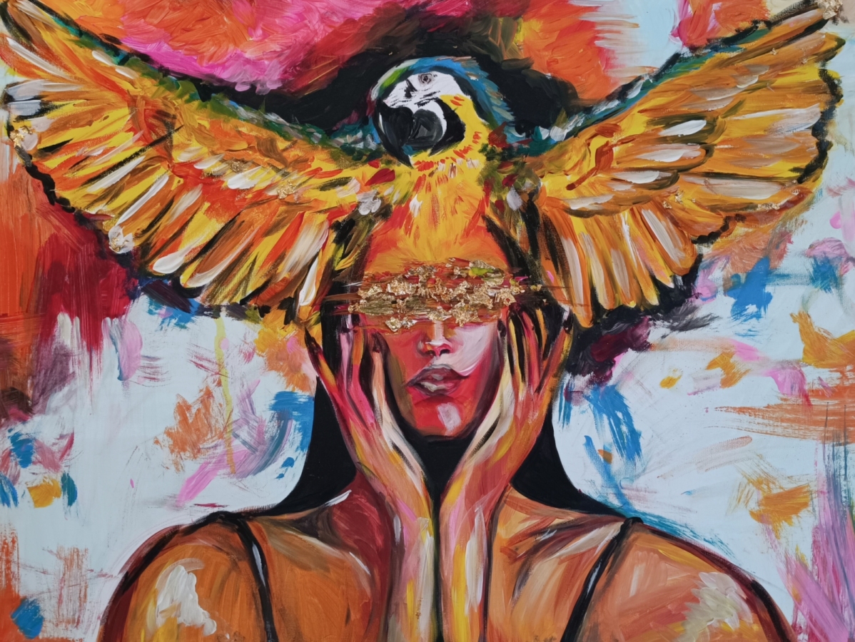 Obraz przedstawia kobiecą postać pogrążoną w introspekcji, której oczy zostały symbolicznie przesłonięte złocistą strukturą, jakby granicą między tym, co widzialne a tym, co odczuwalne. Nad jej głową rozpościera swoje skrzydła papuga – pełna energii, barw i dynamiki. Ptak wyrasta jak manifest wolności i siły ducha, symbolizując przebudzenie emocji, odwagi i autentyczności. Kontrast między spokojną, statyczną postacią a rozedrganymi, płonącymi kolorami otoczenia tworzy napięcie, które sugeruje proces wewnętrznej transformacji. Intensywne żółcienie, czerwienie i oranże potęgują wrażenie ognia, pasji i przebijającej się świadomości. „Przebudzenie wolności” to wizualna opowieść o momencie przejścia – od zamknięcia w sobie do rozpostarcia skrzydeł własnej tożsamości.
