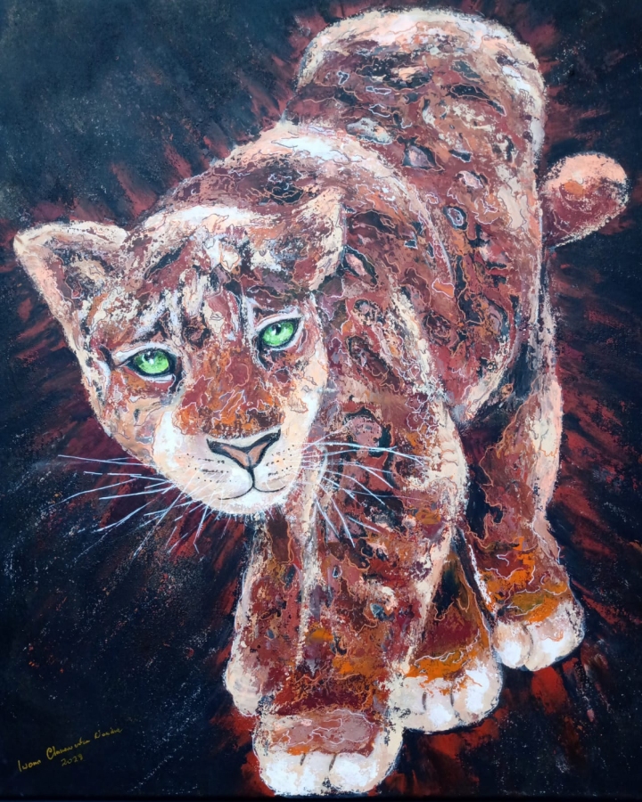 Obraz namalowany farbami akrylowymi marki Renesans i Amsterdam na płótnie w pionie. Prezentuje elastyczną sylwetkę skupionej pumy, gotowej do skoku. Symbolicznie przypomina o uważności i potrzebie skupienia się na chwili obecnej. Obraz prezentuje się pięknie na bardzo jasnej, albo bardzo ciemnej ścianie.