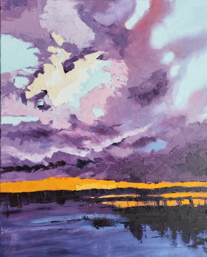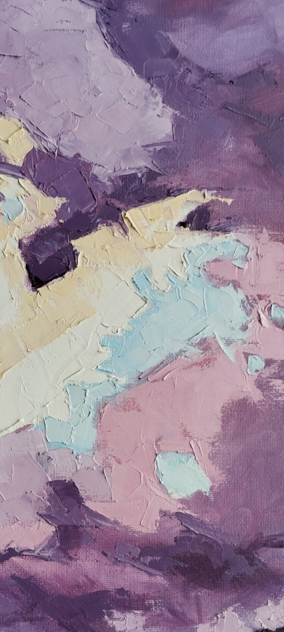 Obraz pełen emocji i koloru – dynamiczny, nastrojowy, przyciągający uwagę. Intensywne fiolety i oranże budują klimat tajemniczego zachodu słońca. Idealny akcent do wnętrza w stylu nowoczesnym lub industrialnym. Każdy detal malowany szpachlą, dzięki czemu praca ma unikalną, trójwymiarową fakturę. Olej na płótnie o wymiarach 50x60 Sygnowany na odwrocie