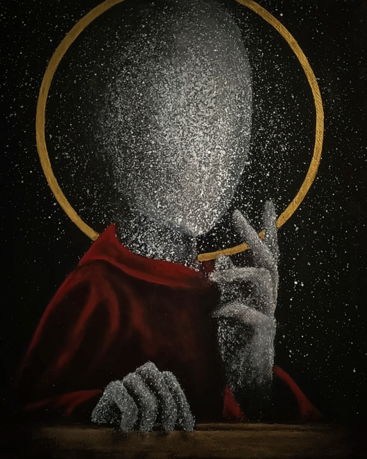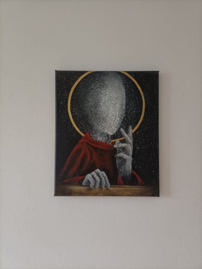 Jeden z obrazów z serii Mystic opowiadających o naturze wiary i jej złożoności. Ulotność bóstw i nasze wyobrażenia o nich są jak ten gwiezdny był ubrany w ludzką szatę- aby sprawiał wrażenie, że jest bliżej nas.