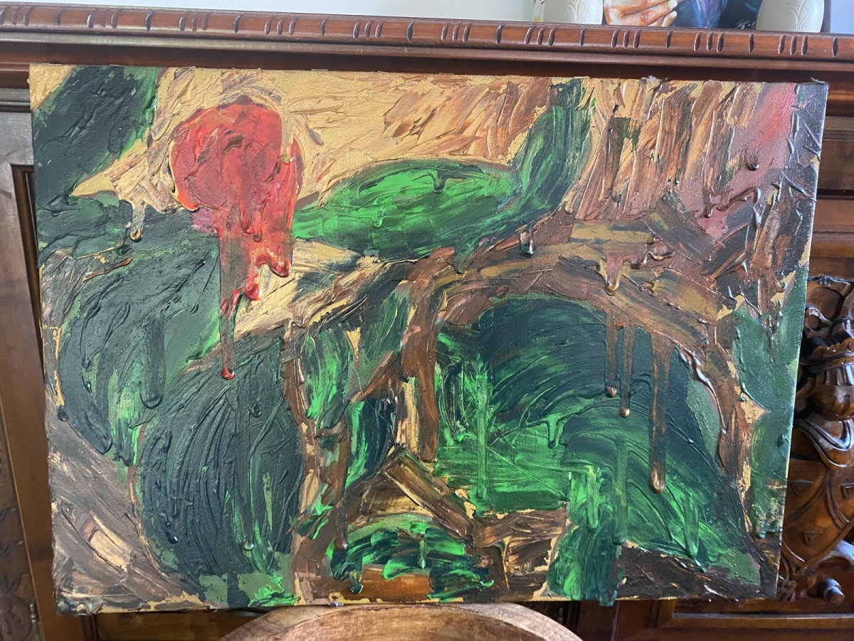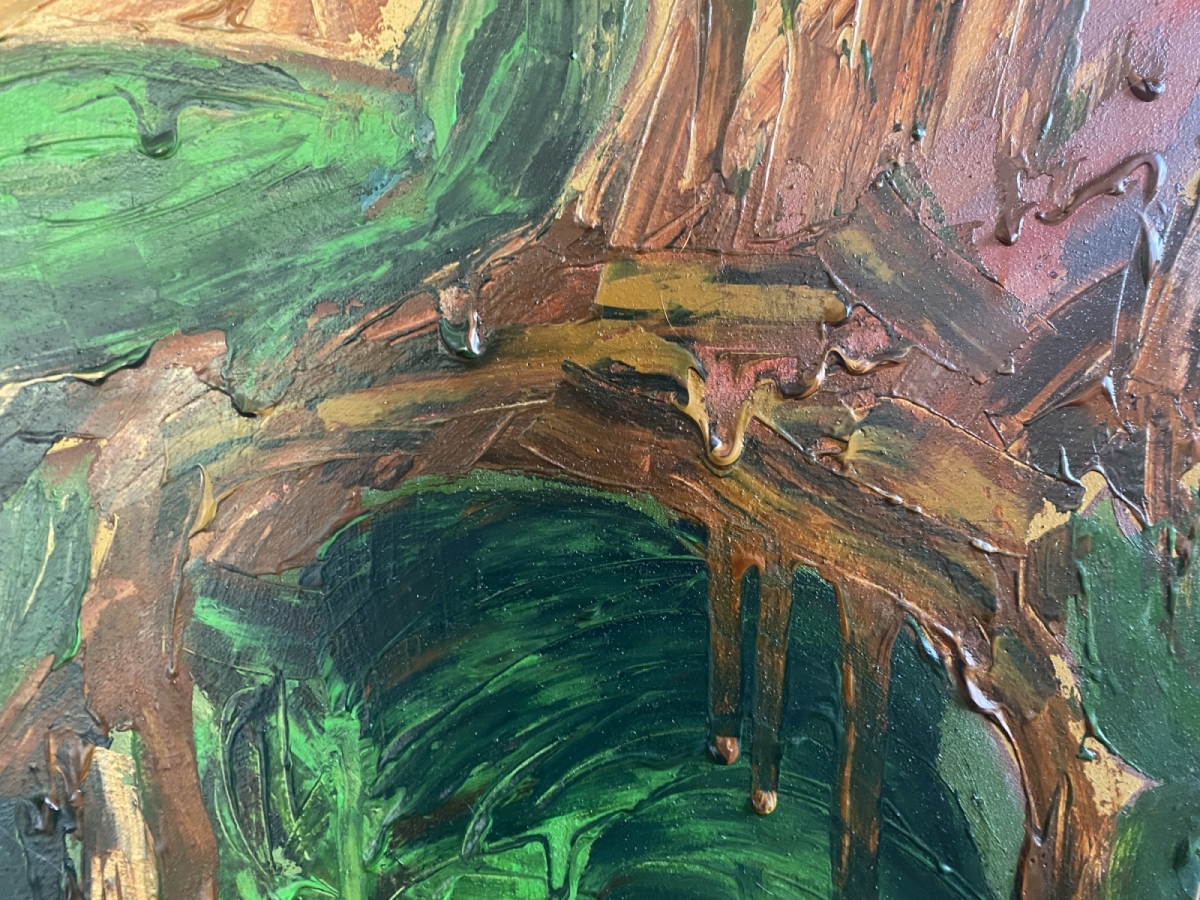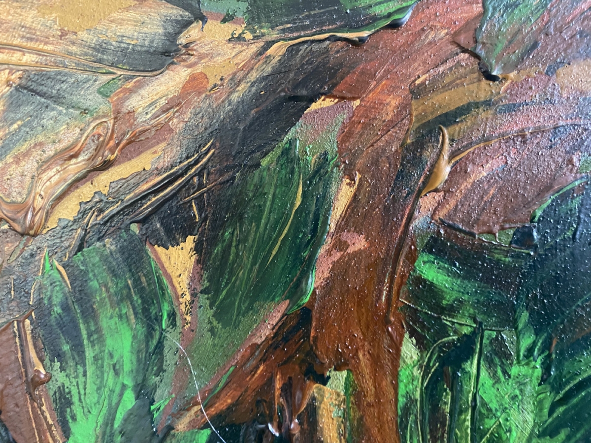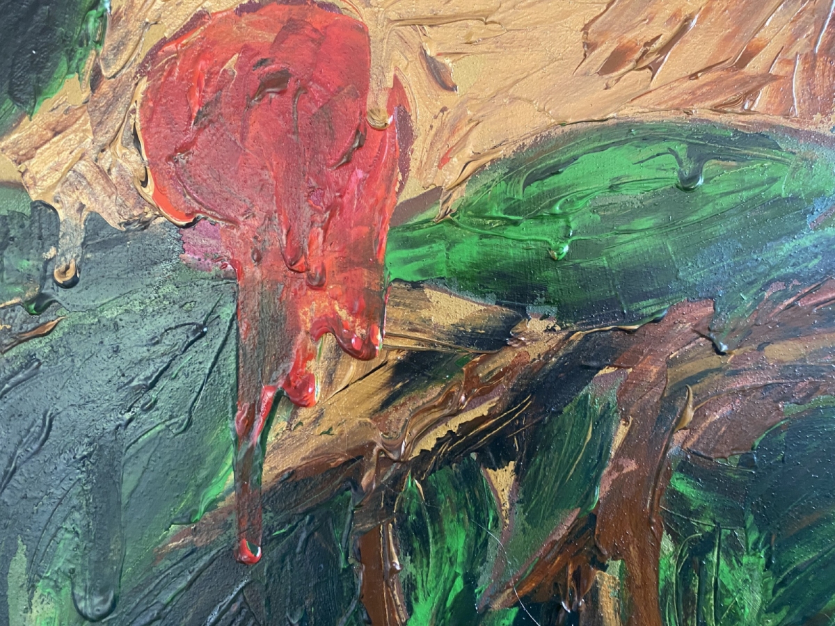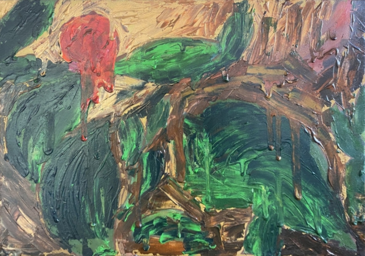 Ciężkie zielenie i złota, z wyraźnymi spływami farby – jak deszcz nad ogrodem emocji. Czerwony akcent bije jak serce. Praca pełna ruchu i nastroju; wprowadza do wnętrza naturalny rytm i głęboki spokój.
