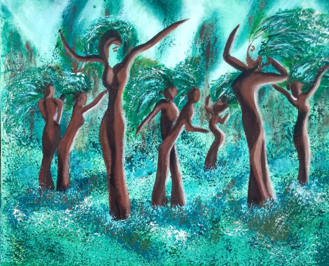 Obraz powstał z miłości do natury, lasów i drzew. Dzisiaj już wiemy, że drzewa czują, u mnie na obrazie wyrażają to w radosnym, szczęśliwym tańcu. Boki są zamalowane, zamontowana zawieszka.