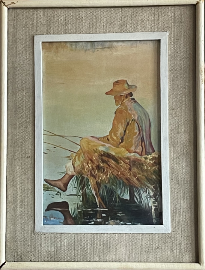 Przedwojenny obraz olejny przedstawiający mężczyznę w kapeluszu siedzącego nad wodą – motyw inspirowany twórczością Leona Wyczółkowskiego, jednego z najwybitniejszych polskich malarzy przełomu XIX i XX wieku. Dzieło zostało namalowane przez mojego Dziadka w okresie międzywojennym. Artysta amator z pasją tworzył kopie obrazów znanych malarzy, dbając o zachowanie klimatu i kolorytu oryginałów. Obraz wykonano techniką olejną na kartonie, zachowany jest w oryginalnej ramie i oprawie z epoki. Ciepła, spokojna tonacja i nastrojowa scena nad wodą nadają tej pracy wyjątkowy urok i ponadczasowy charakter. To nie tylko przykład dawnego malarstwa polskiego, ale też piękny element kolekcji lub dekoracji wnętrza w stylu klasycznym. Sygnatura: "Jerzy Etienne 1933" Wymiary: 27 × 35 cm (z ramą) Stan: dobry, oryginalna patyna czasu.