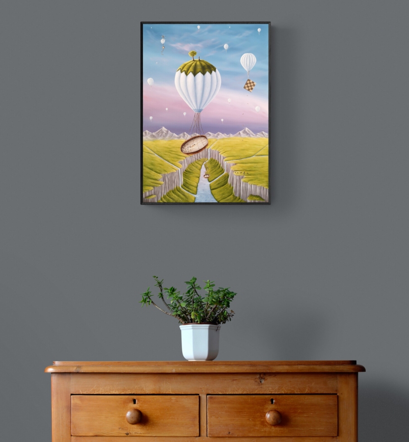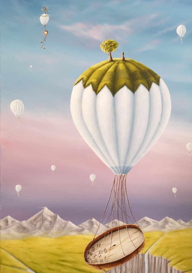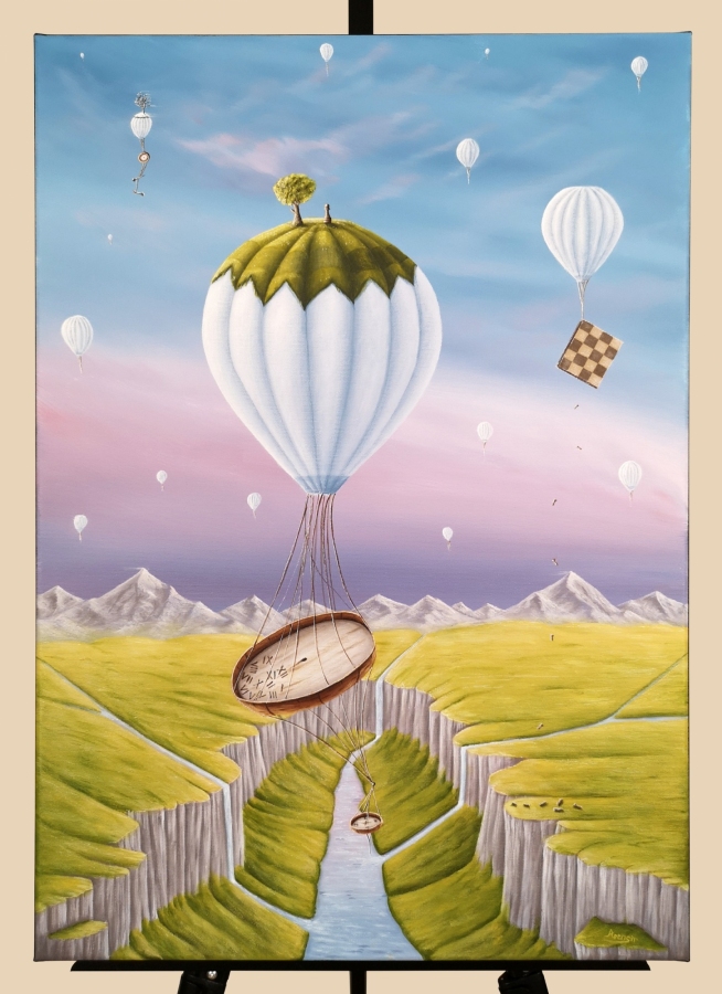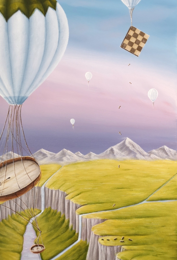 surrealizmfantastykarealizm magicznynadrealizmpejzażPejzaż fantastycznyKrajobrazgóryRzekawodospadbalonszachypionekmotyw szachówczasZegarmotyw czasuDrzewoMalarstwoobrazSztuka Współczesnaakryl