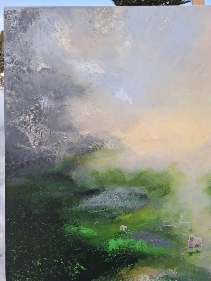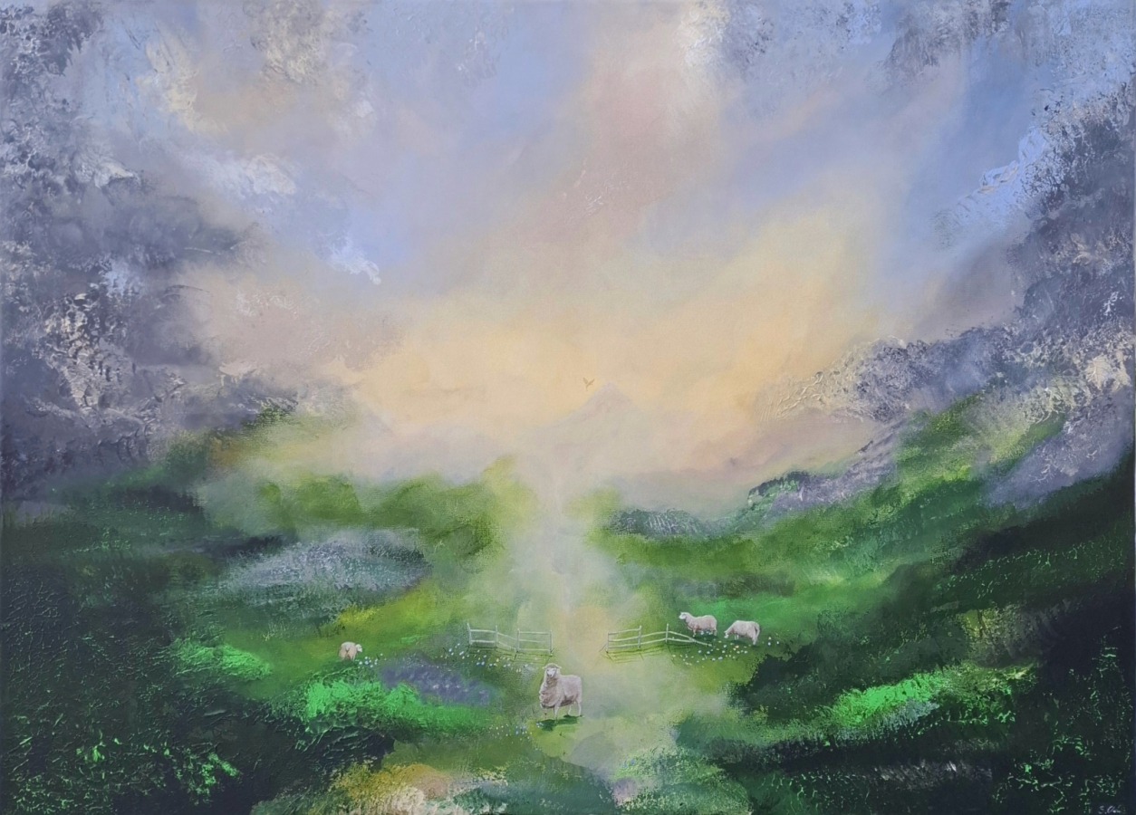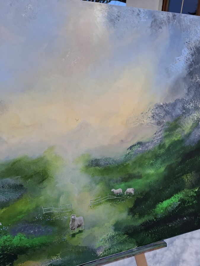 Obraz przedstawia góry Szkocji w wydaniu fantasy ponieważ w głębi obrazu można zobaczyć latającego smoka. Obraz abstrakcyjny namalowany na płótnie o wymiarach 80x110 cm farbami akrylowymi. Obraz zabezpieczony półmatowym werniksem.