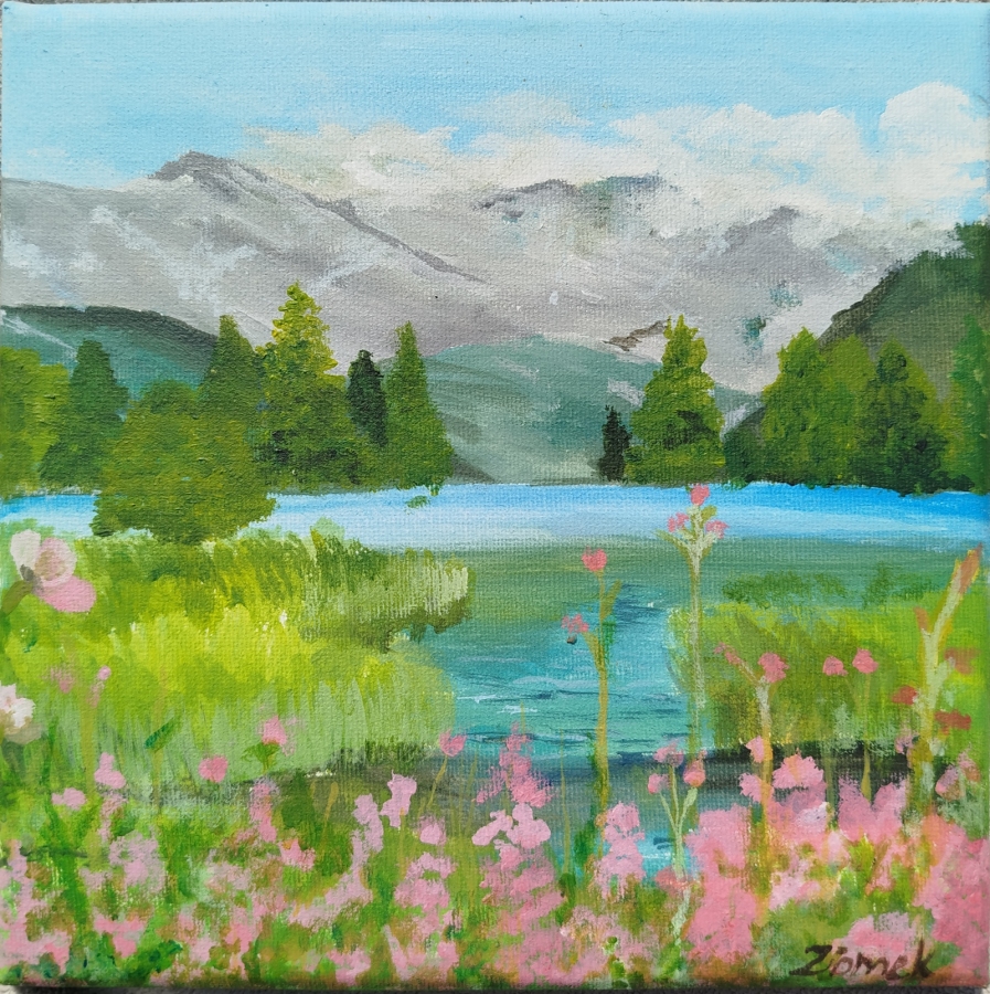 Impresjonistyczny obraz wykonany farbami akrylowymi na płótnie i zabezpieczony werniksem. Przedstawia on letni widok na góry znad jeziora. Najwyższe szczyty spowite są kłębiastymi chmurami. Drzewa zaś znajdujące się u podnóży zdają się tonąć w wodzie. Cała kompozycja została utrzymana w bezruchu co nadaje dziełu harmonii, a w odbiorcy wywołuje błogi spokój.