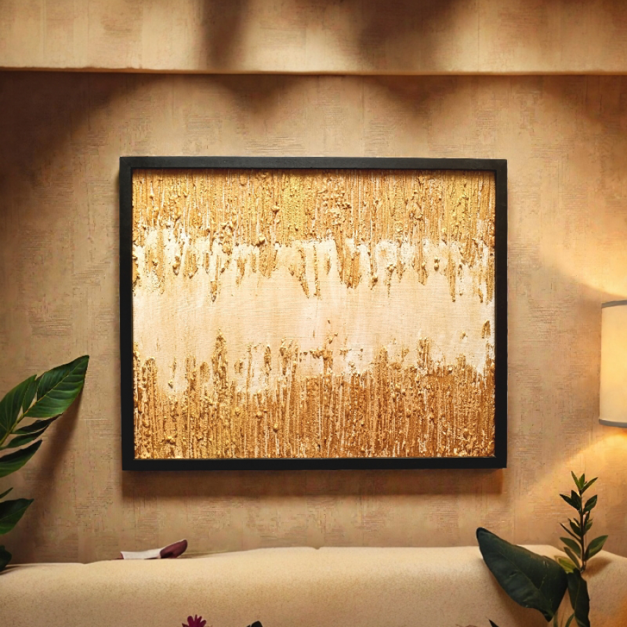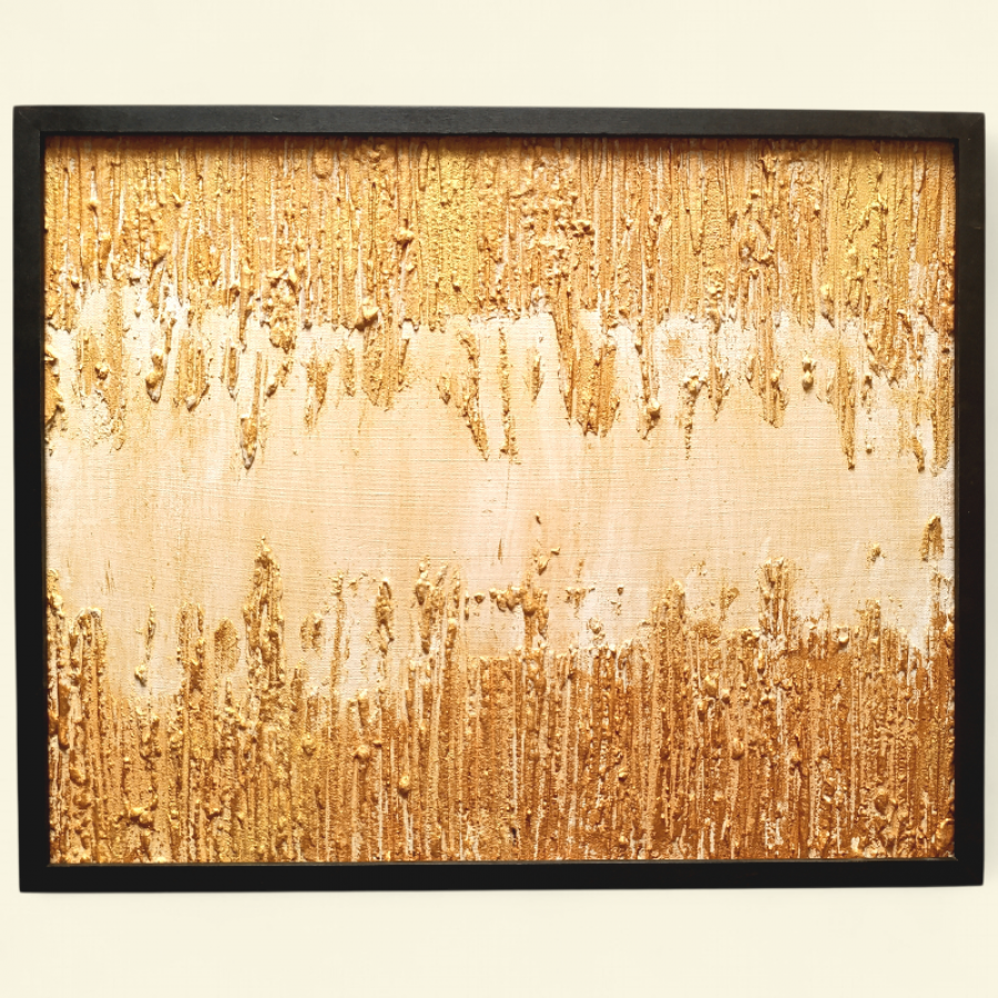 Prezentowany obraz to monumentalna kompozycja abstrakcyjna, która dominuje w przestrzeni dzięki swojej intensywnej, ciepłej kolorystyce oraz niespotykanej głębi. Praca została wykonana w technice impasto, gdzie grube warstwy farby i masy strukturalnej tworzą trójwymiarowy pejzaż emocji. Kluczowe cechy obrazu: Dynamika tekstury: Pionowe żłobienia w górnej i dolnej części płótna tworzą rytmiczną, organiczną strukturę, która przypomina zastygłą lawę lub wodospad światła. Gra światłocienia: Dzięki wysokiemu reliefowi obraz „pracuje” wraz ze zmieniającym się oświetleniem w pomieszczeniu. Każda pora dnia wydobywa z niego inne detale i pogłębia cienie w zagłębieniach tekstury. Harmonia kolorystyczna: Dominujące odcienie złocistej żółci, ugru i delikatnego piasku wprowadzają do wnętrza energię, optymizm i poczucie luksusu. Centralny, gładszy pas kompozycji stanowi moment oddechu, balansując całą strukturę. Dlaczego warto wybrać ten obraz? Ten obraz to nie tylko dekoracja, to statement piece. Idealnie sprawdzi się w nowoczesnych, minimalistycznych salonach, surowych loftach lub reprezentacyjnych biurach. Jego format i tekstura sprawiają, że nie potrzebuje on ramy – sam w sobie stanowi kompletną formę architektoniczną. Wymiary: 50x40 cm] Gotowy do zawieszenia: Boki płótna są zamalowane w kolorystyce dzieła. Sprzedaję z drewnianą ramą. Obraz można powiesić z ramą lub bez ramy.