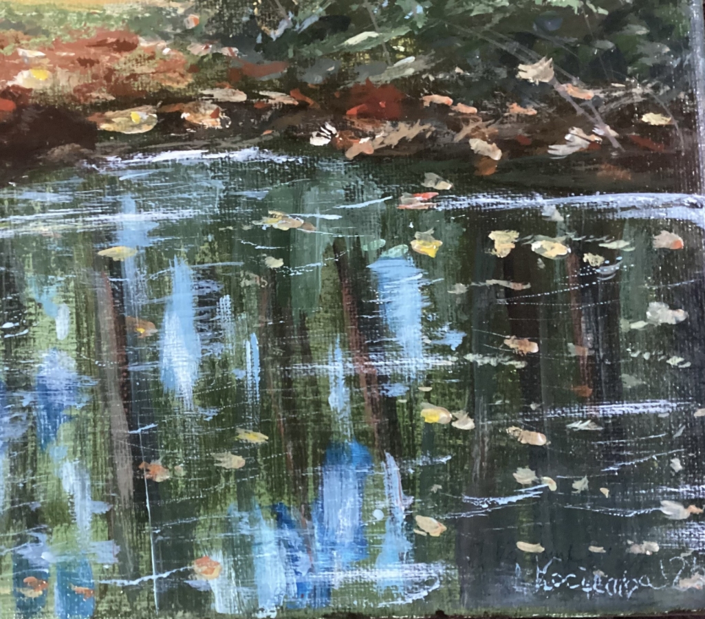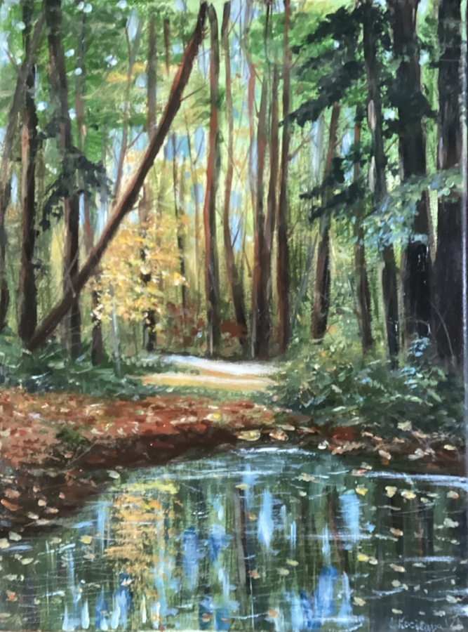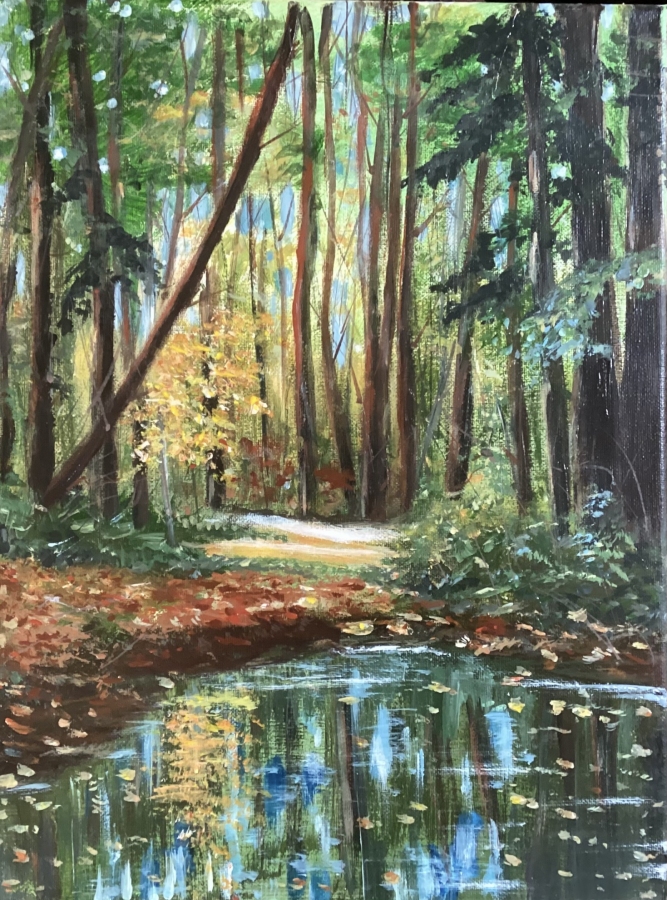 Las skąpany w promieniach słońca ukazany jest w palecie barw ziemi, gdzie ciepłe brązy, zielenie i ochry budują poczucie naturalnej harmonii. Oświetlone drzewa znajdują swoje spokojne odbicie w tafli wody, tworząc dialog między rzeczywistością a jej lustrzanym echem. Gra światła i cienia nadaje kompozycji rytm, a skąpana w blasku światła ścieżka prowadzi wzrok widza w głąb pejzażu, potęgując wrażenie pogodnego, słonecznego dnia — chwili zawieszonej między ruchem a ciszą. Praca zabezpieczona werniksem satynowym.