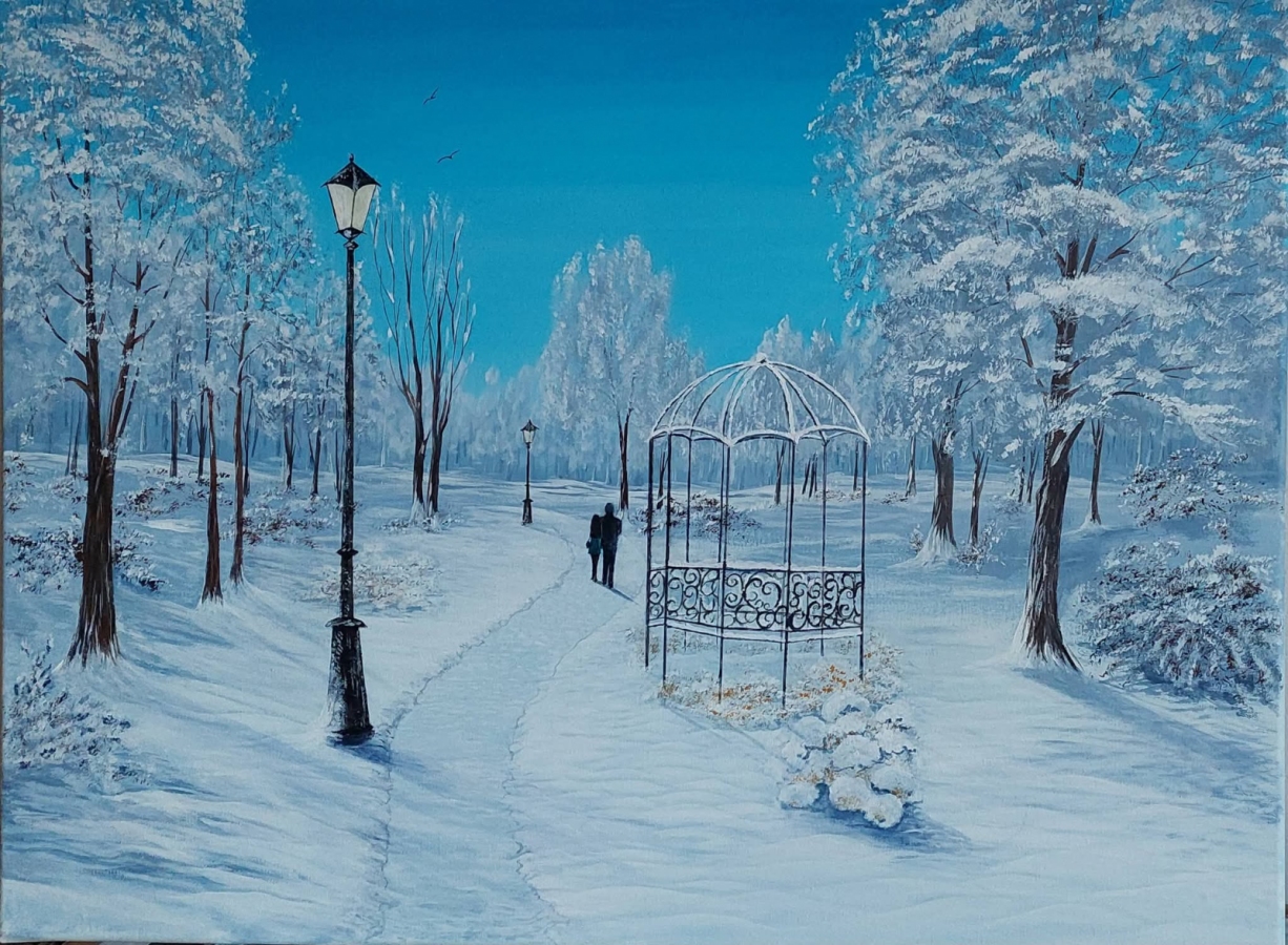 Ten obraz akrylowy przedstawia spokojną, pełną uroku zimową scenę w parku. Ośnieżona alejka wije się między drzewami pokrytymi delikatnym, białym puchem, tworząc atmosferę ciszy i wyciszenia. Na pierwszym planie widoczna jest ażurowa, metalowa altana otulona śniegiem, a nieco dalej — para spacerująca alejką, dodająca kompozycji ciepła i ludzkiej obecności. Całość utrzymana jest w chłodnej, harmonijnej palecie błękitów, bieli i subtelnych szarości, które znakomicie oddają krystaliczność zimowego światła. Niebieskie niebo rozświetla scenę, nadając obrazowi świeżości i lekkości. Obraz idealnie sprawdzi się jako dekoracja salonu, sypialni lub przestrzeni wypoczynkowej — wprowadza atmosferę spokoju, romantyzmu i zimowej magii.