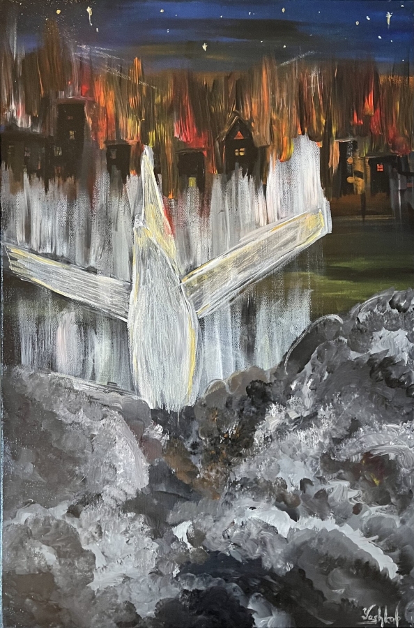 Ta praca rozpoczyna kolekcje „Niebajkowe sny” Obraz narodził się ze snu niepokojącego, ciężkiego, pełnego emocji i bezsilności. We śnie widziałam samolot spadający na miasto ogarnięte płomieniami. Ogień pochłania budynki, niebo było czarne, ale pośród dymu wciąż błyszczały pojedyncze gwiazdy. To nie tylko wizja wojny, która pochłania Ukrainę, lecz także symbol wewnętrznej katastrofy, jakiej doświadcza każdy człowiek, gdy jego świat ulega zniszczeniu. "Spadający samolot i płonące miasto" to moja próba uchwycenia strachu, bólu i jednocześnie wiary w to, że nawet z popiołów może narodzić się światło.