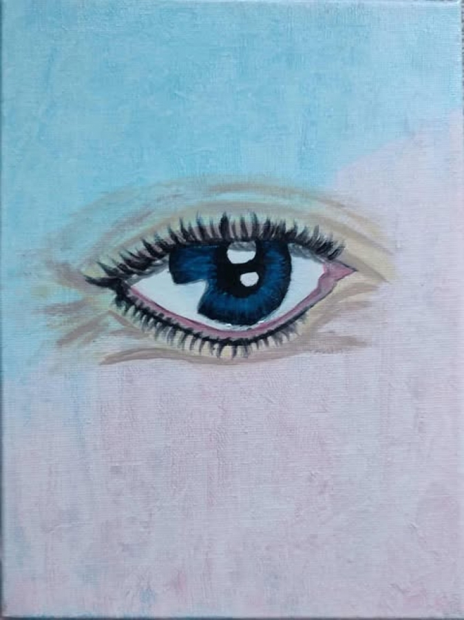 Obraz na płótnie, namalowany farbami akrylowymi. Stworzyłam ten jak obraz gdy byłam kolejny raz wycieńczona po pracy, emocje i zmęczenie same wylewały się na płótno. Powstało dzięki temu zwierciadło duszy, okno które każdy z nas zasłania lub też nie, ukrywając lub pokazując swoje prawdziwe "Ja".