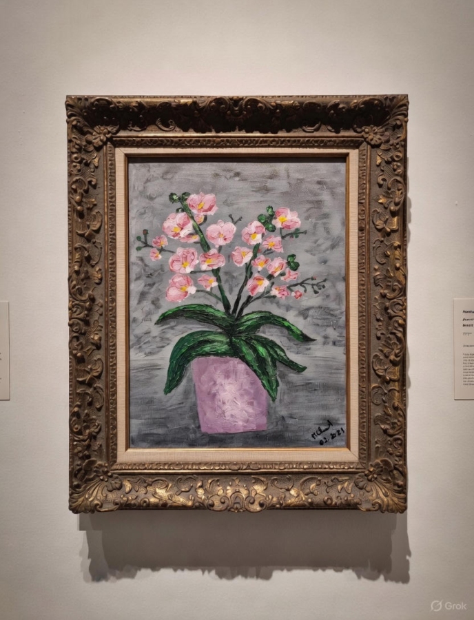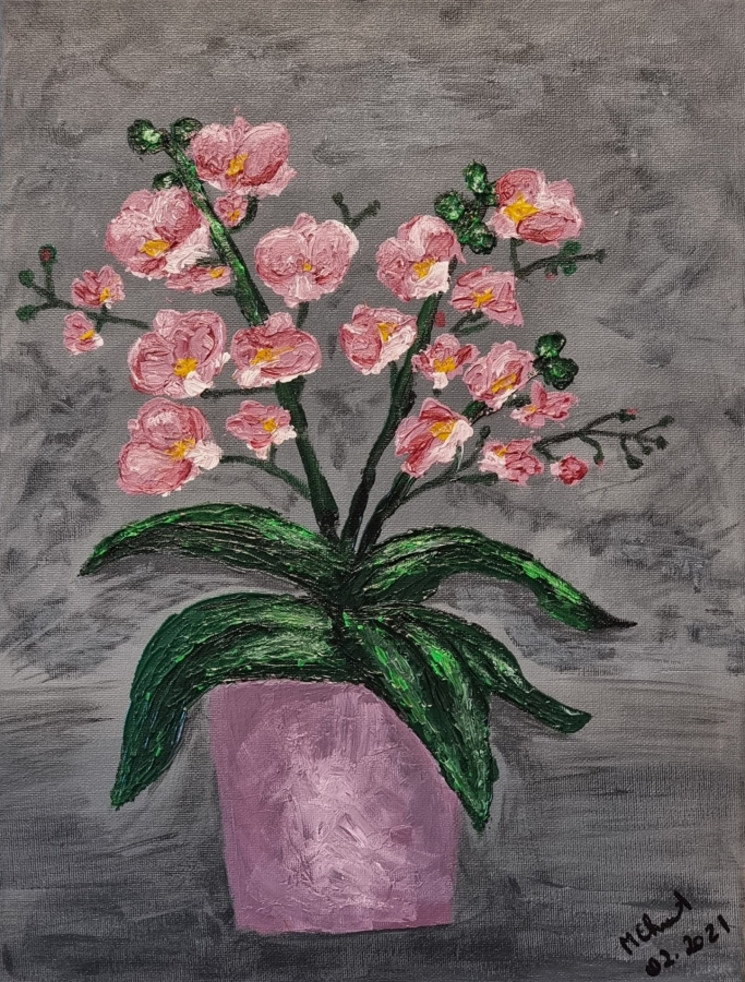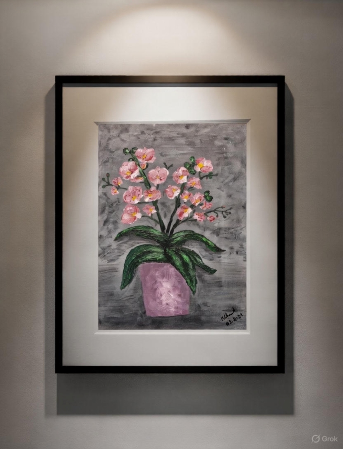 Obraz przedstawia realistyczną, a jednocześnie ekspresyjną martwą naturę z kwitnącym w doniczce. Centralnym motywem jest bukiet delikatnych, różowych kwiatów z lekkim gradientem – od bladego różu po bardziej nasycone krawędzie. Środki kwiatów zaznaczone są ciepłym żółtym akcentem, co dodaje im naturalnego blasku. Łodygi i pąki są ciemnozielone, a szerokie, mięsiste liście u podstawy rośliny namalowane grubą, reliefową warstwą farby, co nadaje im niemal trójwymiarową fakturę. Doniczka ma prosty, geometryczny kształt i jest utrzymana w subtelnym, lawendowo-różowym odcieniu, który harmonizuje z kolorem kwiatów. Tło jest monochromatyczne – różne odcienie szarości, namalowane szerokimi, rozmytymi pociągnięciami pędzla, co tworzy wrażenie neutralnej, spokojnej przestrzeni, skupiającej całą uwagę na roślinie. Faktura płótna jest widoczna, a impastowa technika malowania dodaje obrazowi dynamiki i materialności. Całość emanuje elegancją, delikatnością i spokojem. Obraz ma charakter dekoracyjny, ale dzięki wyrazistej fakturze i stonowanej palecie barw zachowuje też artystyczną głębię – idealnie wpasowałby się we współczesne, minimalistyczne wnętrze. Praca idealnie nadaje się na prezent dla fanów storczyków. Ten storczyk nigdy nie umrze. Autorce nigdy nie udało sie opanować sztuki kwiaciarskiej ????. Oprawione prace są wyłącznie wizualizacją i propozycją ekspozycji.