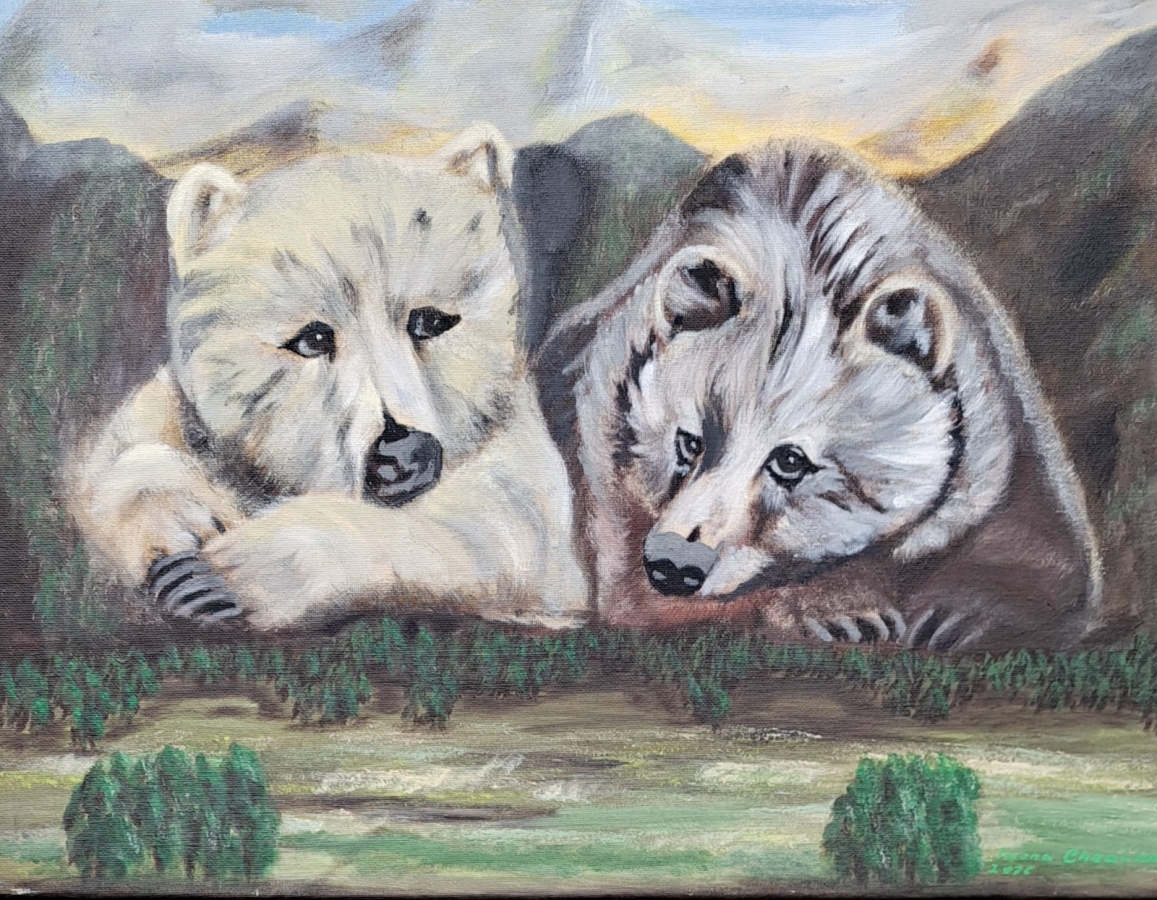 Niedźwiadki tworzą góry i i stają się ich strażnikami. Miła dla oka panorama górska. Obraz ma zamalowane boki i zamontowaną zawieszkę.