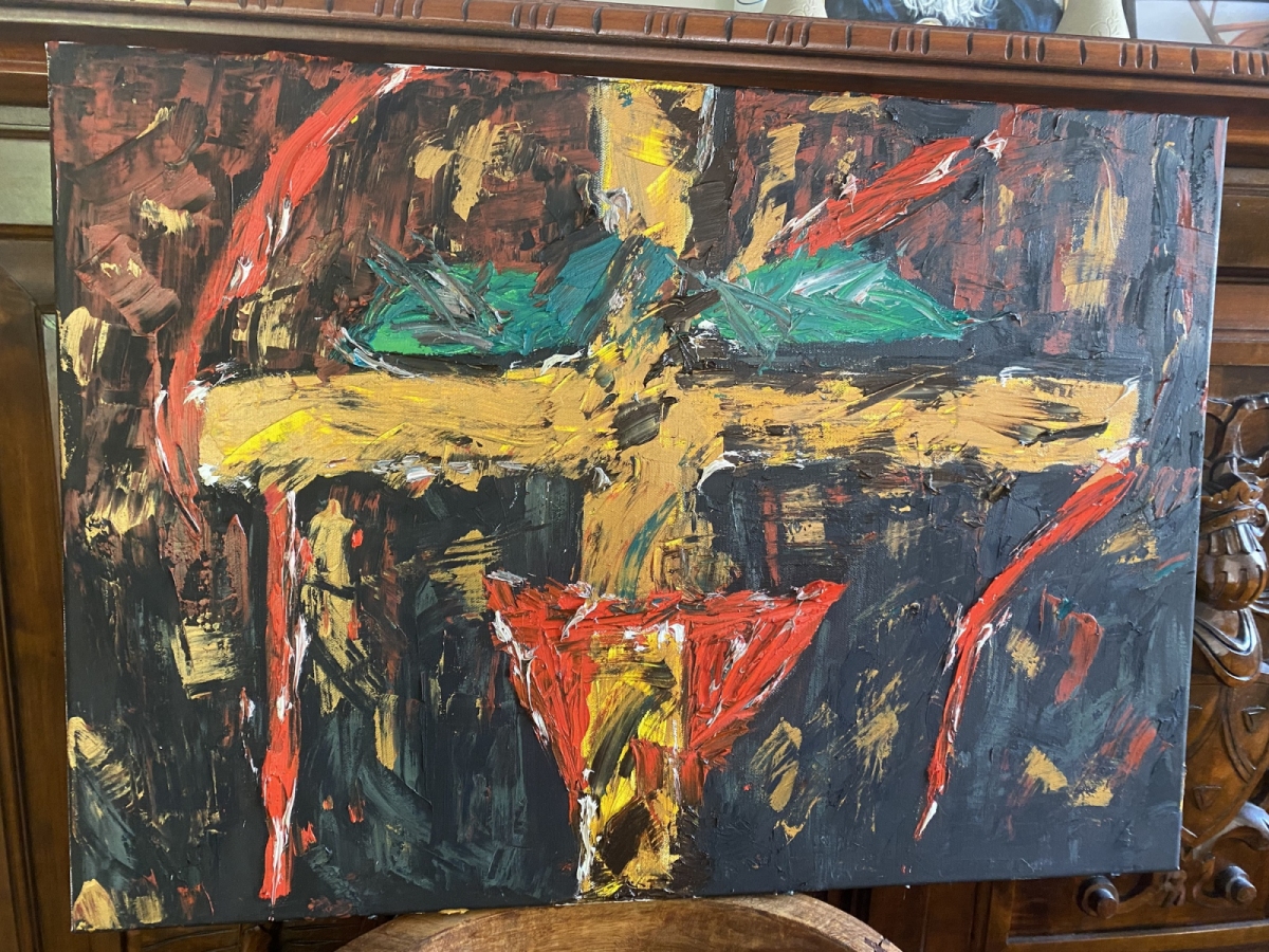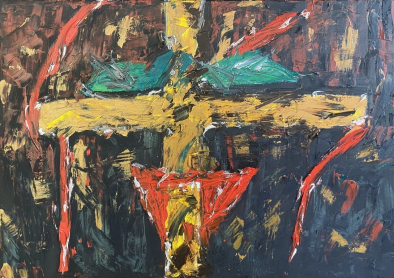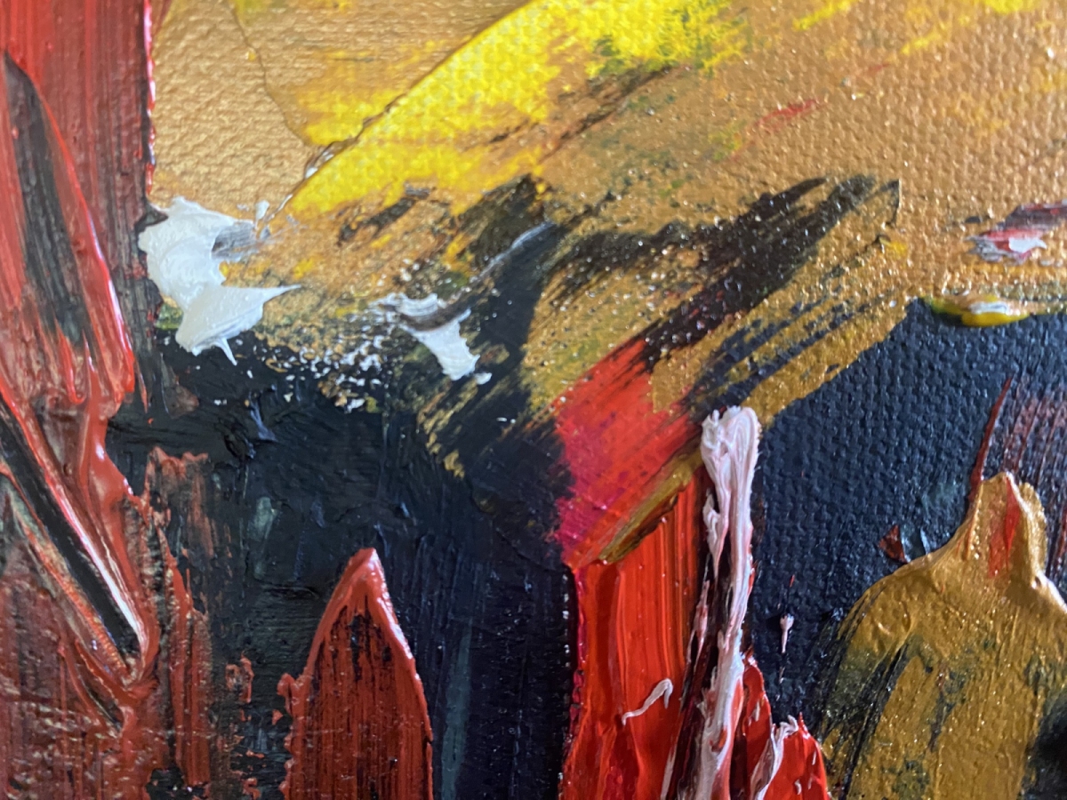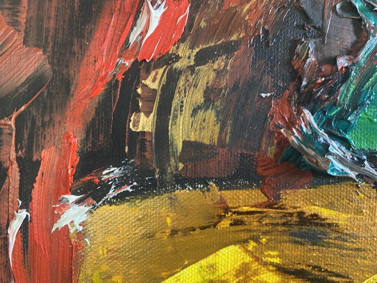 Złoto, czerwień i zieleń tworzą znak, który jest jednocześnie kruchy i mocny. Warstwy oleju układają się w rytuał przemiany – z ciemności w światło. Obraz intensywny, odważny, świetny jako centralny punkt wnętrza.