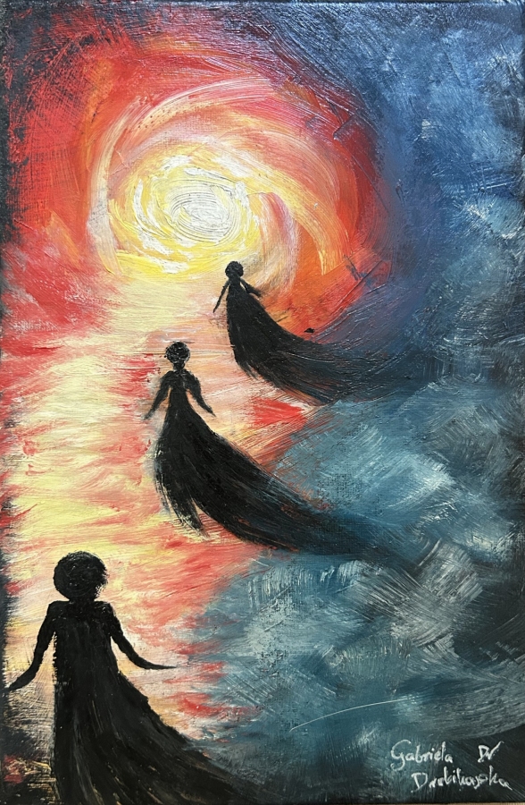 Obraz olejny na małym płótnie bawełnianym, praca przedstawia ekspresjonizm, który symbolizuje powrót ludzi do światła. Okazuje pośmiertne wyobrażenie ludzi i to co ich czeka. Kolory dobrane do dzieła nie są przypadkowe i każdy z nich ma znaczenie aby zrozumieć przedstawione elementy.