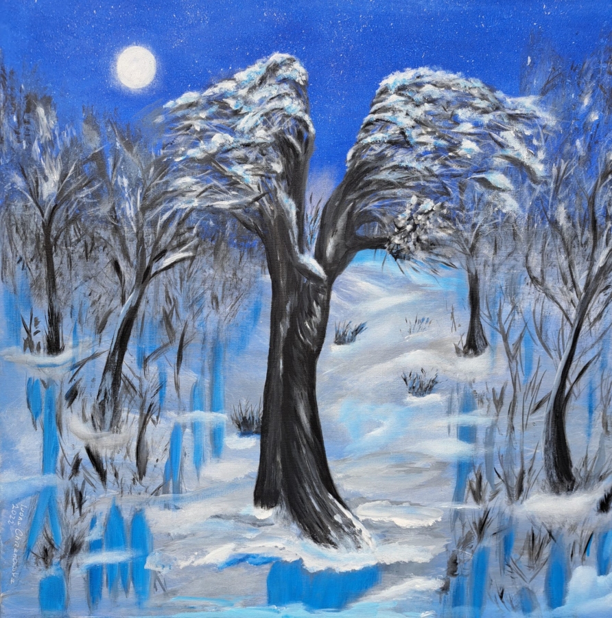 Moje drzewa często tańczą na obrazach. Tutaj w zimowej scenerii nieruchome, a jednak rozszalałe w tańcu, pokryte śniegiem, przy pełni księżyca, radosne drzewa. Boki są zamalowane, zamontowana zawieszka.