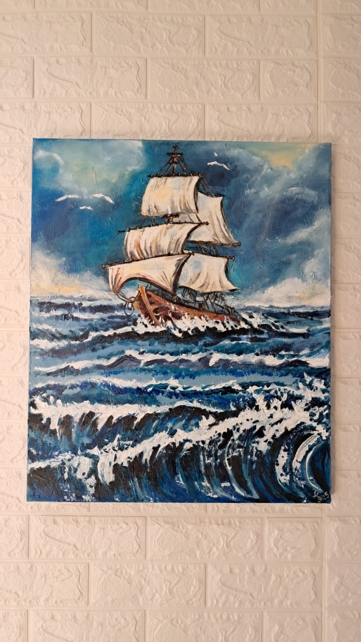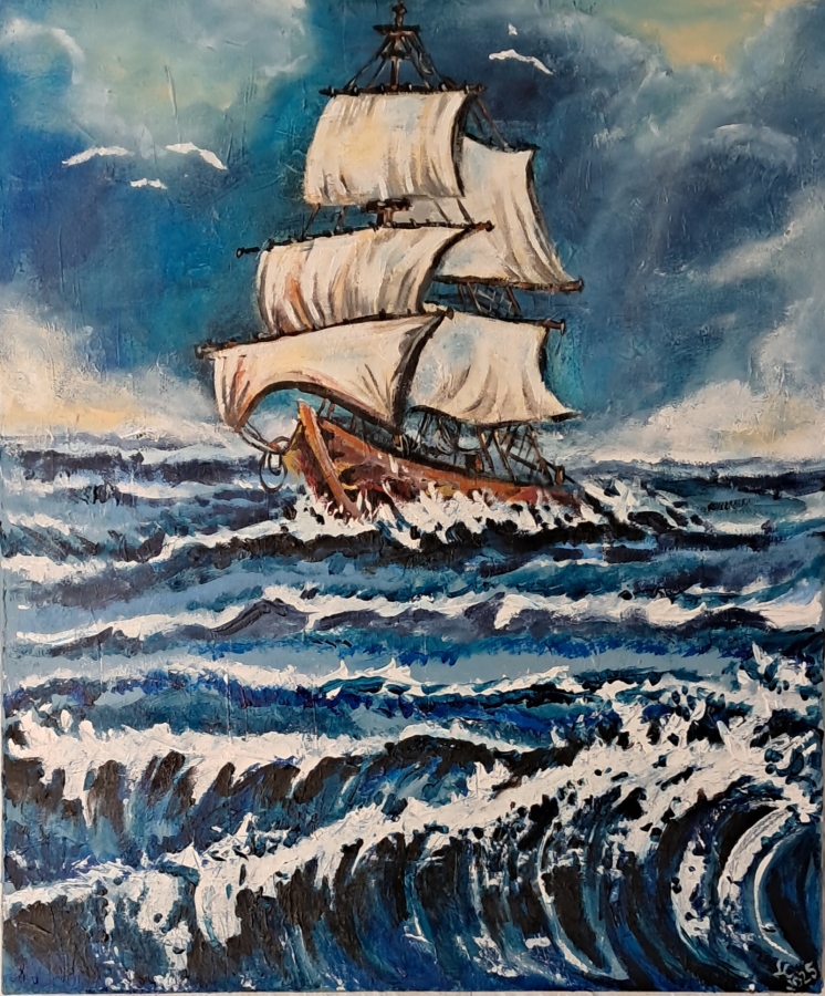 Obraz ekspresyjny ,pełen przygody i wprowadzający w nastrój pragnienia podróży.Kolorystyka chłodna dominuje niebieski.Morze wykonane szpachlą co daje efekt szalonych fal, statek wprowadzony dynamicznie przedziera się przez spiętrzone morze.