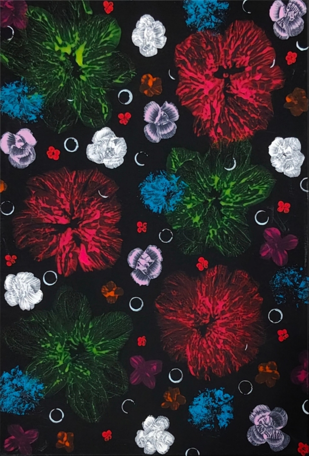 To wizualny szept nocy. Na aksamitnie czarnym tle rozkwitają formy, które nie do końca chcą być kwiatami — raczej śladami emocji, odciśniętymi kolorem. Czerwień wygląda tu jak żar pod skórą obrazu, zieleń jak chłodny oddech równowagi. Jasne, drobne elementy migoczą niczym wspomnienia, które pojawiają się i znikają. Kompozycja jest gęsta, ale nie ciężka - bardziej jak sen, w którym wszystko ma sens, choć trudno go opowiedzieć słowami.