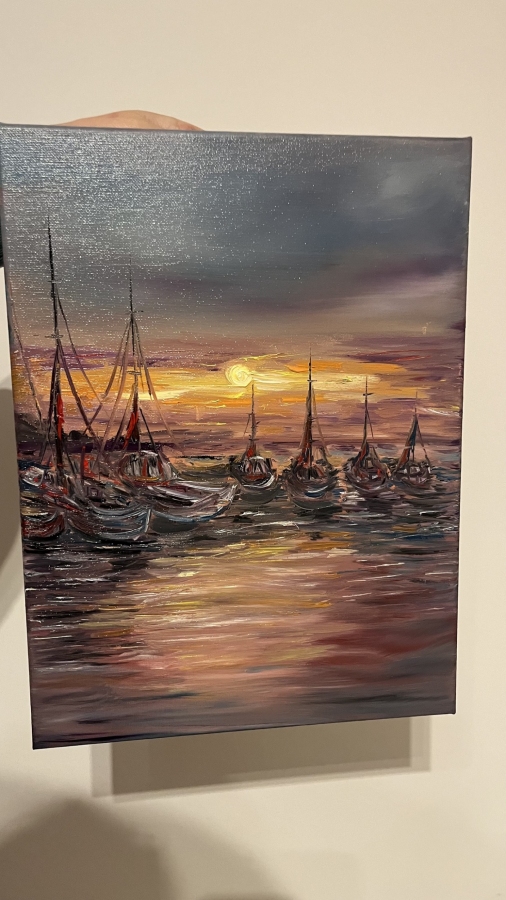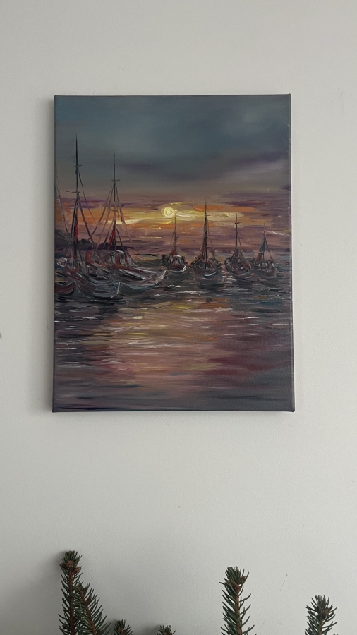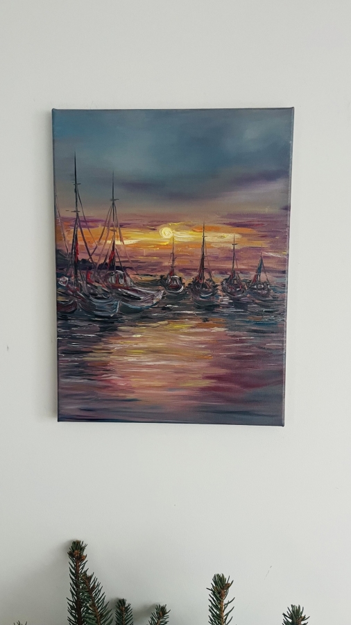 Zachwycający, ręcznie malowany obraz olejny przedstawiający spokojny port o zachodzie słońca. Ciepłe refleksy na wodzie i sylwetki łodzi tworzą niepowtarzalny, kojący klimat. Idealny do salonu, sypialni lub biura — dodaje elegancji i przytulności każdemu wnętrzu. Unikat — tylko jeden egzemplarz.