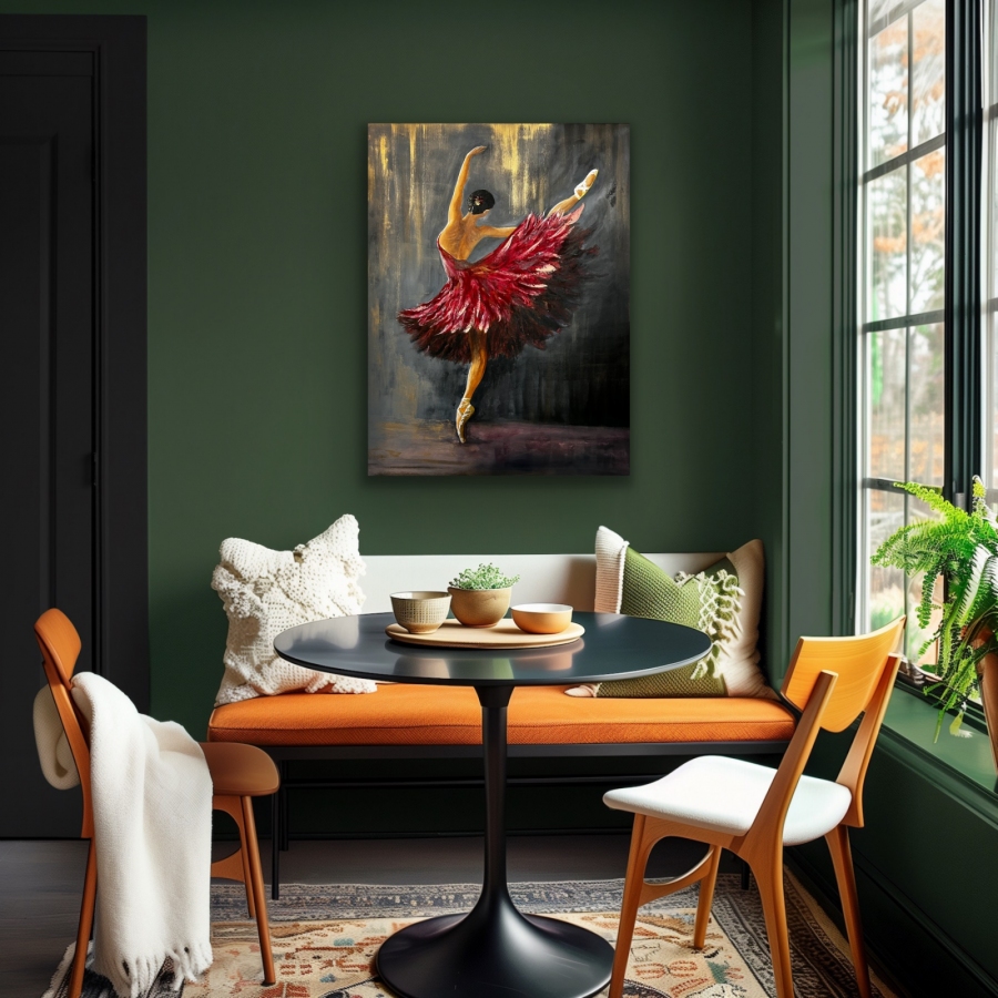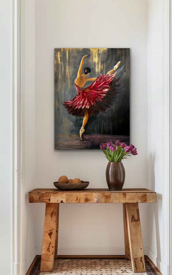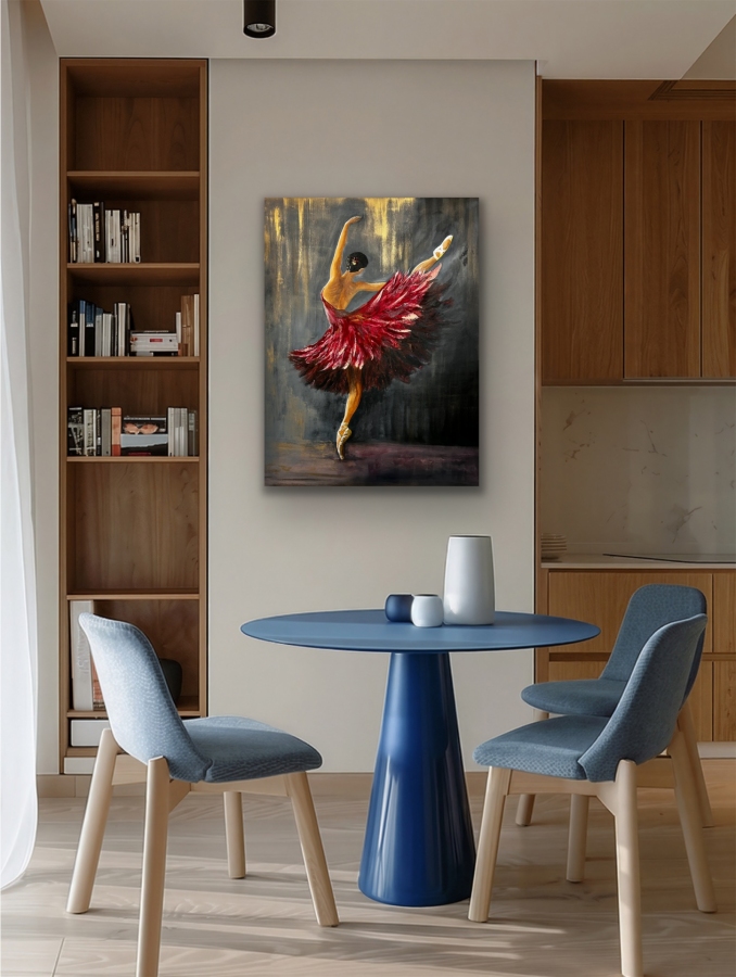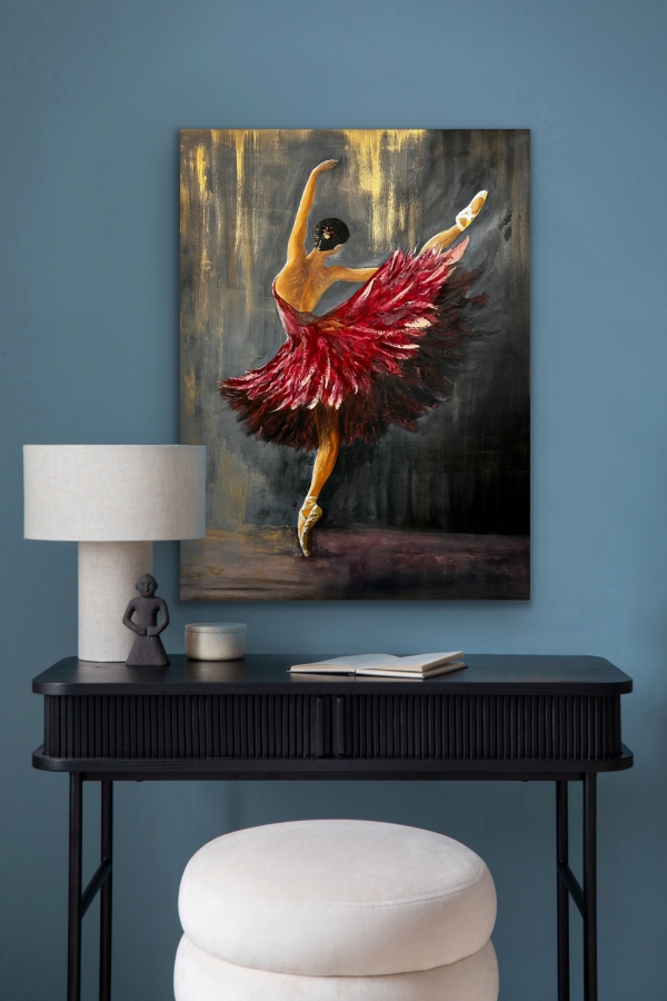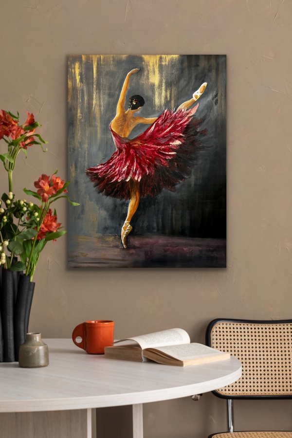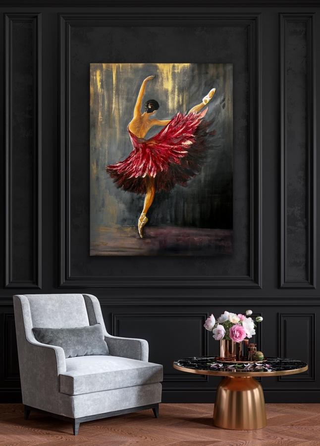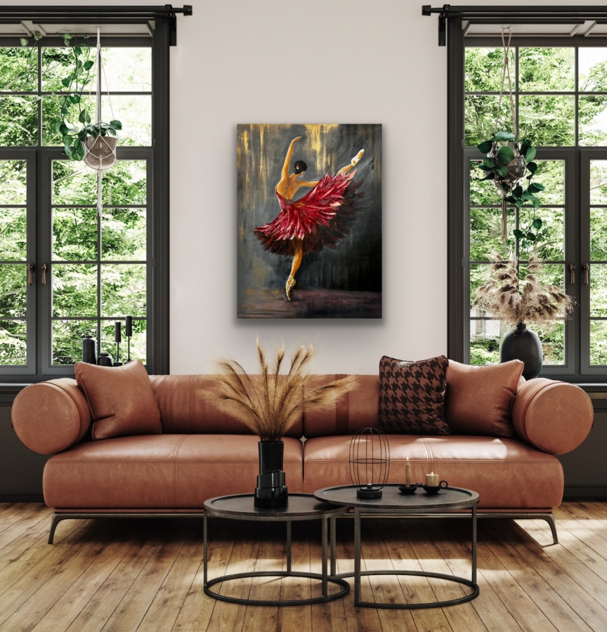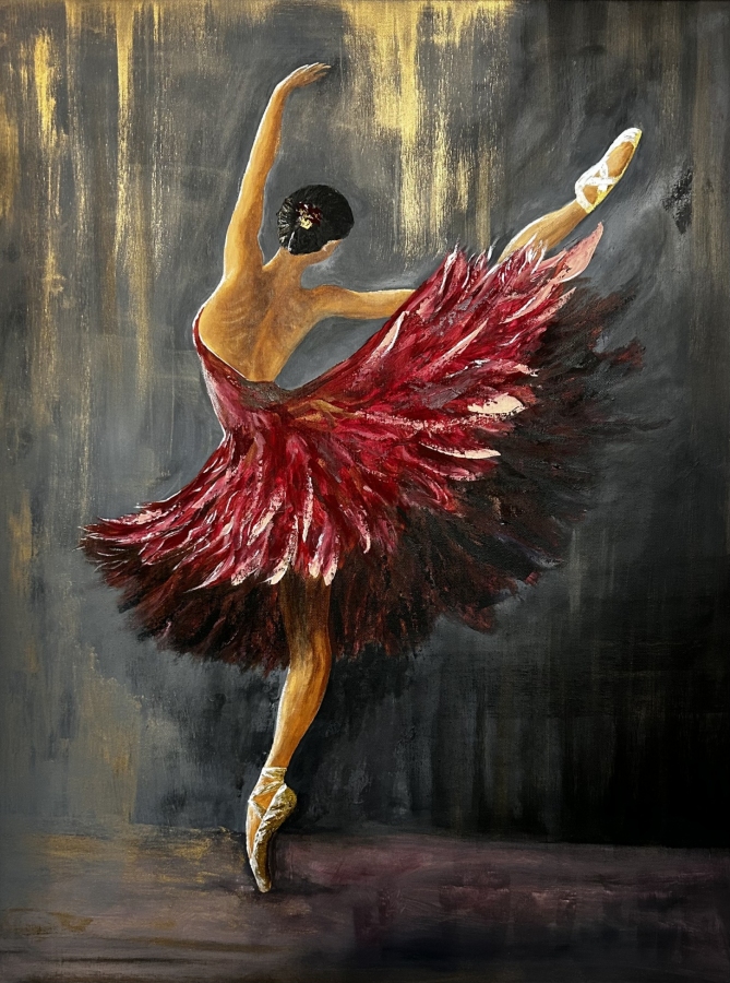 Dynamiczny, pełen ekspresji obraz przedstawiający baletnicę w momencie najwyższego napięcia ruchu. Intensywna czerwień sukni kontrastuje z głębokim, złocisto-czarnym tłem, podkreślając energię i lekkość tanecznej pozy. Praca łączy realizm postaci z ekspresyjną fakturą i współczesną estetyką, tworząc kompozycję emanującą siłą, pasją i elegancją.