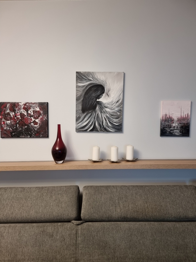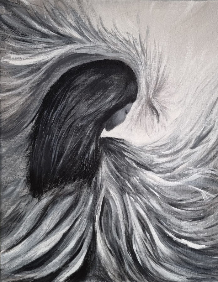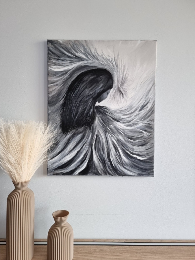 Obraz namalowany na płótnie farbami akrylowymi pędzlami. Praca jest monochromatyczna w odcieniach szarości. Ramka obrazu zamalowana jest w jednolitym szarym kolorze. Autorka przedstawiła tancerkę w ruchu. Praca powstała w okresie malowania postaci kobiet w różnych odsłonach. Przedstawiona praca może być eksponowana bez ramy. Dobrze zaprezentuje sie w nowoczesnych monochromatycznych wnętrzach ale również jako element uspokojenia przestrzeni.