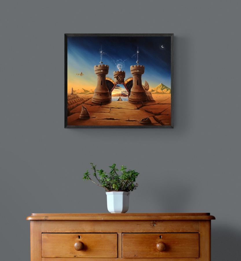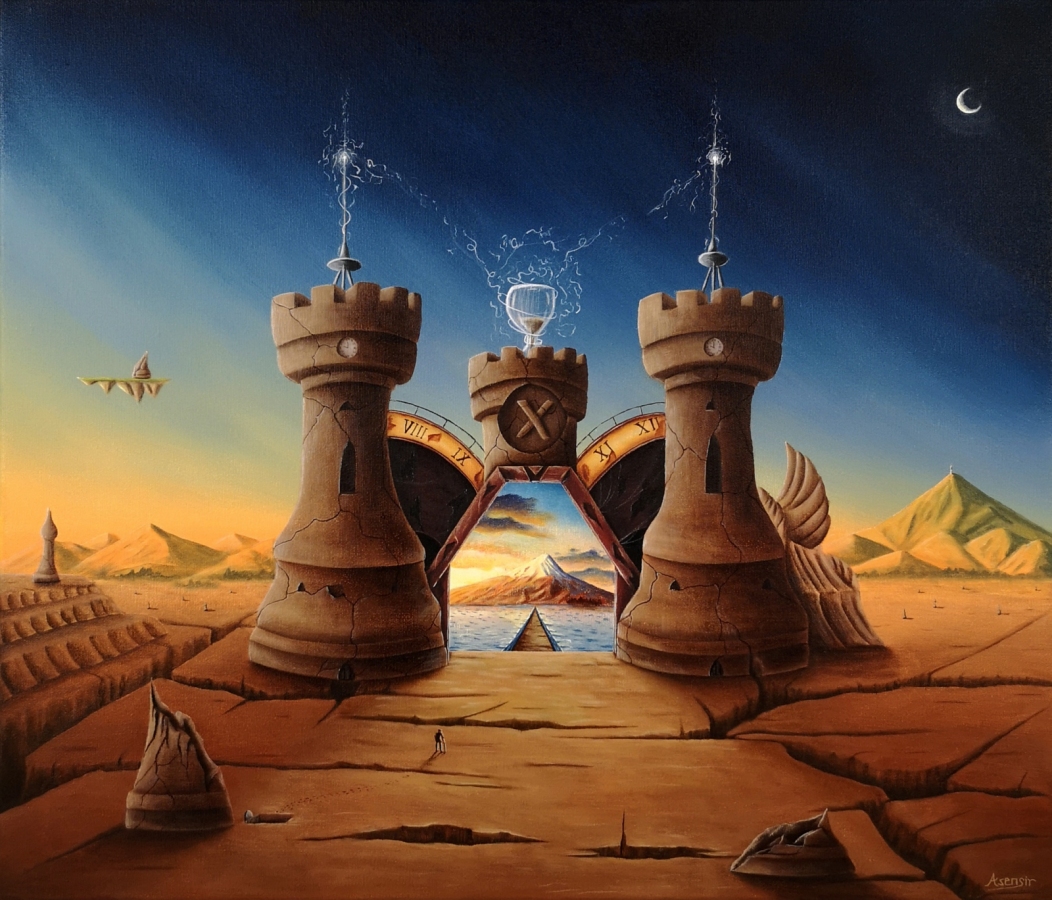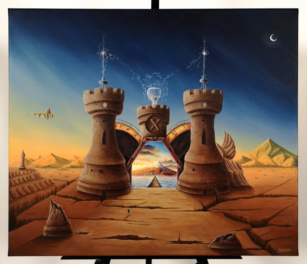 Obraz akrylowy na płótnie bawełnianym, malarstwo surrealistyczne. Praca sygnowana: z przodu - podpis artysty „Asensir”, z tyłu – tytuł / podpis, imię i nazwisko artysty / rok powstania. Praca nie zawiera ramy, boczne krawędzie płótna zamalowane estetycznie na czarno - obraz gotowy do powieszenia. Wymiary: 60x70x2cm. Obrazy artysty są spojrzeniem w świat snów. W pracach z cyklu „Time” zgłębia on naturę czasu - jego złożoność, iluzoryczność i wpływ na nasze decyzje oraz sposób postrzegania rzeczywistości. Kompozycje, portale i motyw szachów tworzą spójny system symboli - metaforę wyborów, przemijania i nieustannej gry między tym, co kontrolowane, a tym, co wymyka się przewidywaniom. „Time” to opowieść o naszych ruchach w ponadczasowej rozgrywce - próba uchwycenia jednocześnie ulotności i trwałości doświadczeń. To świat, w którym czas przestaje być prostą linią i zamienia się w labirynt - przestrzeń poszukiwania własnej drogi, szans i utraconych momentów. Prace artysty znajdują się w prywatnych kolekcjach w Polsce oraz m.in. w USA, Japonii, RPA, Niemczech, Hiszpanii, Francji, Izraelu.
