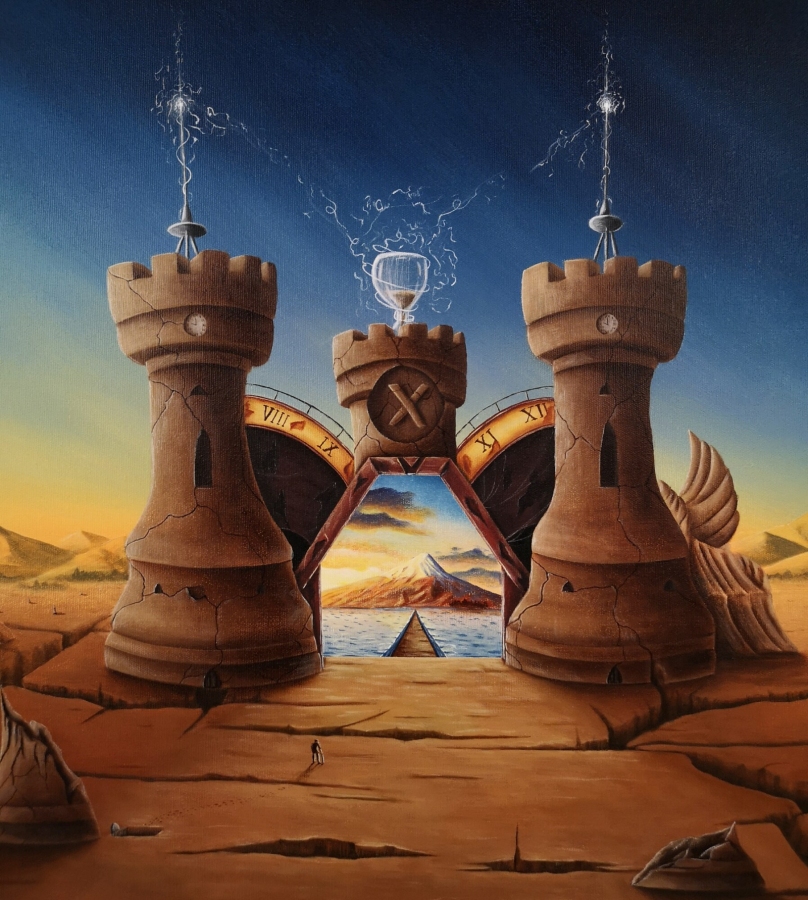surrealizmfantastykarealizm magicznynadrealizmPejzaż fantastycznyczasZegarklepsydraportalportal czasupejzażKrajobrazzachód słońcagóryMalarstwoobrazSztuka Współczesnaakryl