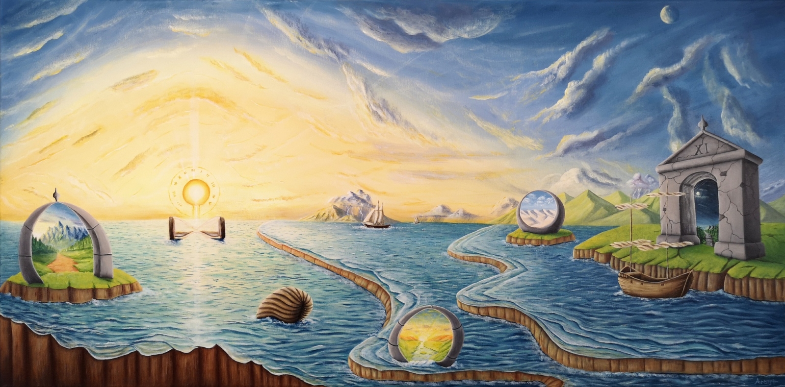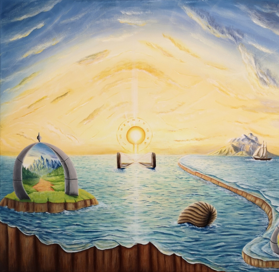 surrealizmfantastykarealizm magicznynadrealizmPejzaż fantastycznypejzażKrajobrazmorzezachód słońcaczasZegarklepsydraportalportal czasugóryNiebieskiżółtyobrazSztuka WspółczesnaakrylMalarstwona prezent